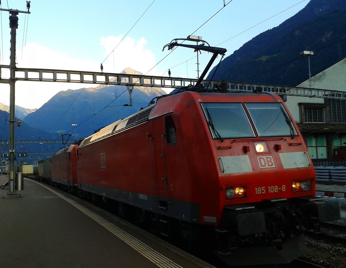 Dämmerung am Bahnhof Erstfeld. Hier verlassen soeben Re 460 081-3 und Re 460 031-8 mit IR 2438 (Locarno - Zürich HB) den Bahnhof. (21.7.2015) Hans-Peter Kurz