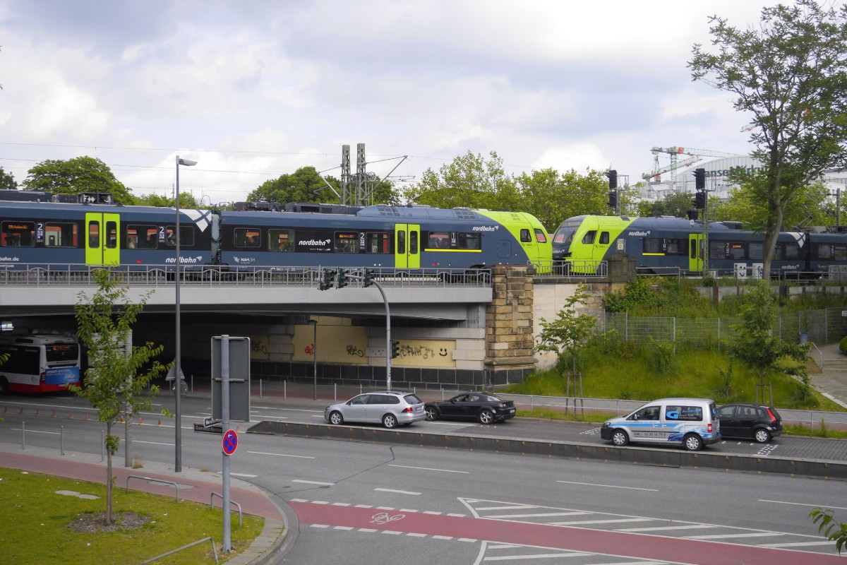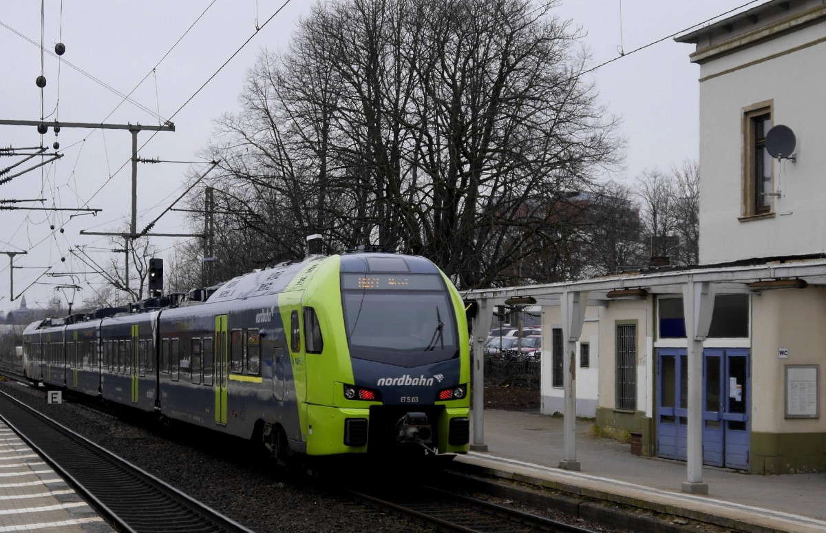ET 5.03 der Nordbahn (1429 003) hat in Pinneberg die Umsteiger aus der S-Bahn aufgenommen und setzt seine Fahrt nach Wrist fort (11.2.15) Hermann-Josef Weirich