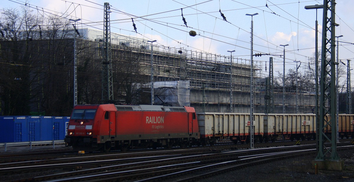 185 292-0 von Railion kommt aus Richtung Köln,Aachen-Hbf,Aachen-Schanz mit einem Kurzen Schrottzug aus Österreich nach Belgien und fährt in Aachen-West ein.