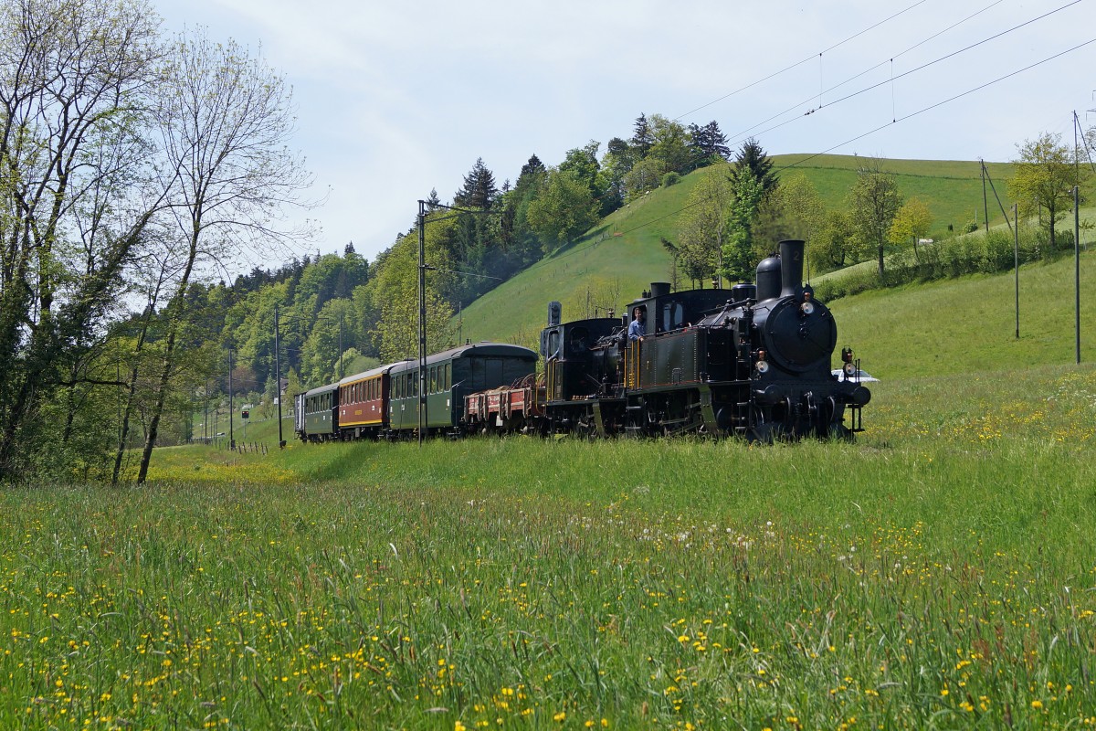 VHE: Auf der auf Busbetrieb umgestellten Teilstrecke Sumiswald Grünen - Huttwil verkehren wieder Dampfzüge. Am 10. Mai 2015 waren mehrere Dampfzüge unterwegs von DBB und VHE. VHE Dampfzug mit der Doppeltraktion Ed 3/4 2 ehemals SMB und der Ed 3/4 Nr. 11 ehemals LHB bei Dürrenroht auf Muttertagsfahrt.
