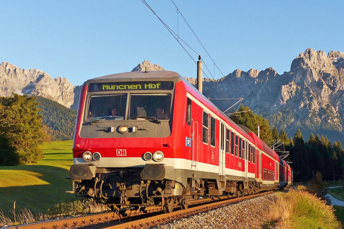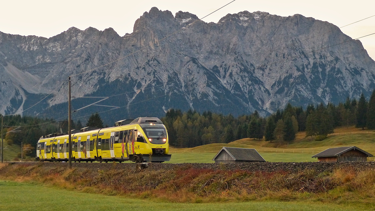 Ankommen, Koffer in die Ferienwohnung und sofort an die Strecke. Besonderen Spaß macht dies erstens, wenn die Wohnung nur 100 Meter von der Mittenwaldbahn entfernt liegt und zweitens, wenn "Kaiserwetter" am Karwendel (im Hintergrund die Soierngruppe) angesagt ist. Ein Hamster (BR 2 442 Österreich tauglich) kommt im abendlichen Sonnenlicht die Schmalenseehöhe hinunter. Der Triebwagen ist auf der Relation Innsbruck - Mittenwald (REX) - München (RB) unterwegs. Noch etwa eine Minute ist es bis Klais. Bahnstrecke 5504 München - Hbf. Mittenwald Grenze am 04.10.2015 Ivonne Pitzius
