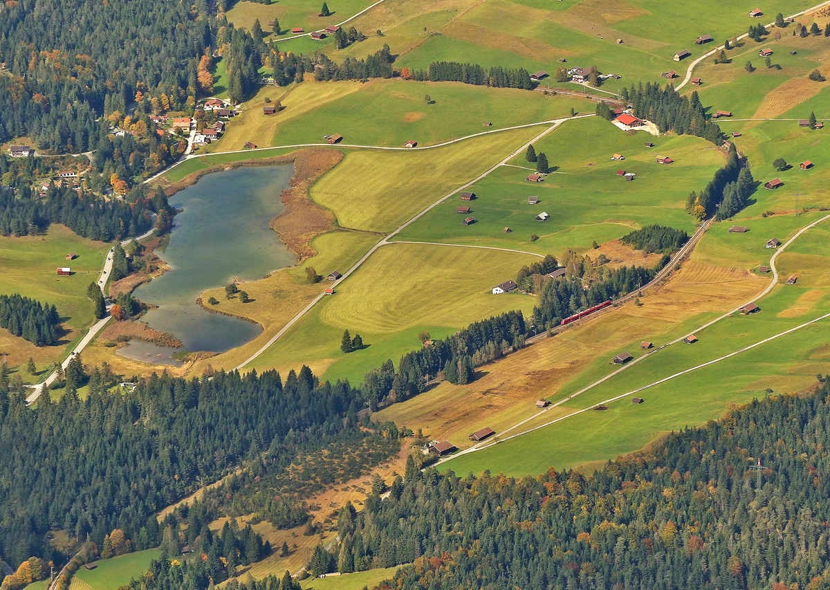 . Suche den Zug – Bei herrlichem Herbstwetter sind wir am 05.10.2015 in Mittenwald mit der Karwendelbahn zur Bergstation gefahren. Auf 2244 Meter war die Aussicht ungetrübt und so konnte ein unerkannt gebliebener Hamster (ein vieteiliger Bombardier Talent 2 der BR 442) auf der Mittenwaldbahn bildlich verewigt werden. Der Zug hat als RB Mittenwald – München Hbf den Bahnhof von Mittenwald vor kurzer Zeit verlassen, er umrundet jetzt den Schmalensee, um dann über die Schmalenseehöhe in Richtung Klais zu fahren. (Jeanny) De Rond Hans und Jeanny