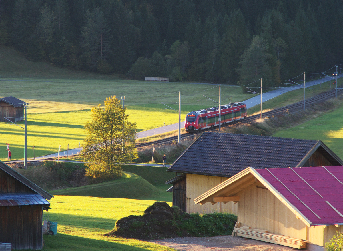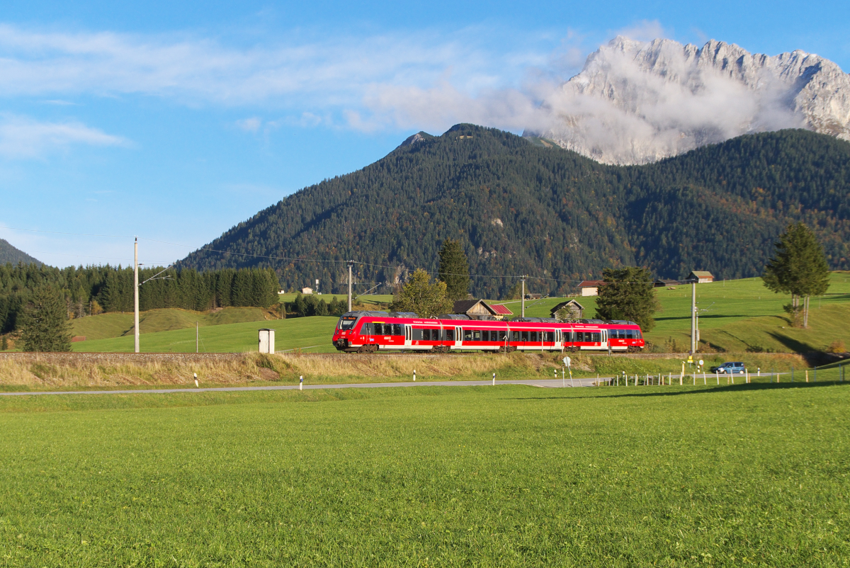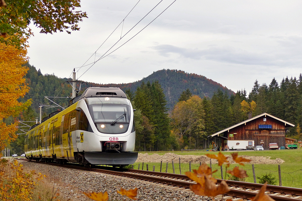 Im Wochenumlauf vom 05.10.2015 bis 10.10.2015 war ein ÖBB Werbetalent auf der Mittenwaldbahn anzutreffen. 4024 088-9 trägt Werbung für die Raiffeisenbank. Außergewöhnlich ist, dass der Werbetalent nur auf einer Stirnseite das ÖBB Emblem trägt, auf der anderen Stirnseite trägt er das Raiffeisenlogo. Der Triebwagen ist auf der Relation Innsbruck - Mittenwald - Garmisch-Partenkirchen unterwegs und hat gerade den Bahnhof von Klais verlassen. Bahnstrecke 5504 München Hbf. - Mittenwald Grenze am 05.10.2015 Erhard Pitzius