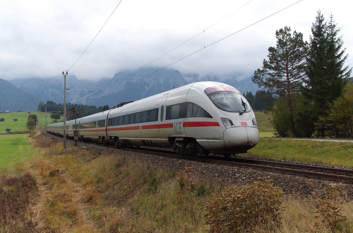 Auch an trüben Tagen lohnt es sich an die Strecke zu gehen, besonders wenn ein ICE mit Tempo 40 an einem vorbei zuckelt. ICE 1206 Mittenwald - Berlin Gesundbrunnen rollte gerade die Schmalenseehöhe hinunter und erreicht gleich das Einfahrsignal von Klais. In garmisch-Partenkirchen wird der nächste Planhalt sein. Bahnstrecke 5504 München Hbf. - Mittenwald Grenze am Landhaus Wackerl, unserem Feriendomizil. 10.10.2015 Erhard Pitzius