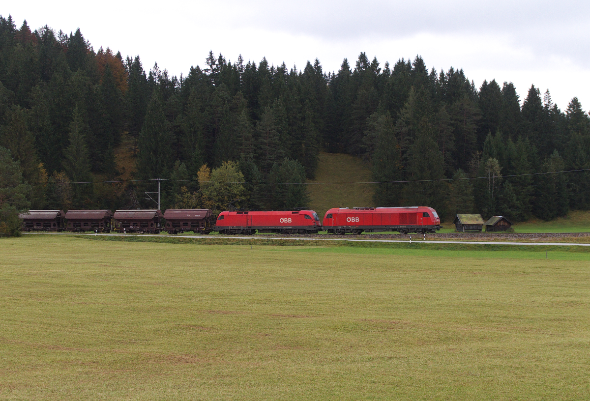 nach der Zugkreuzung in Klais wuchten ein ÖBB Hercules und ein ÖBB Taurus den schweren Zug die Schmalenseehöhe in Richtung Mittenwald hinauf. In dieser Woche war der Zug immer gut mit 10 bis 15 Wagen ausgelastet. Im Jahr 2014 fuhr er auch schon mal mit 3 - 4 Wagen. 08.10.2015 Bahnstrecke 5504 München - Mittenwald Grenze beim Landhaus Wackerl Am Quicken. Ivonne Pitzius