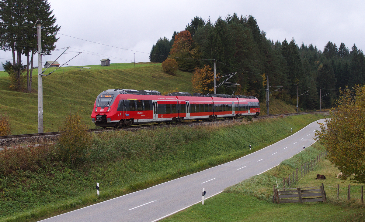 Während, Hans, mein Schatzi und ich den kleinen Anstieg in Richtung Buckelwiesen in Angriff genommen hatten, wartete Jeanny am Feldweg BÜ (links am Andreaskreuz) auf die Züge. Ein Hamster gleitet als RB (REX) München - Mittenwald - Innsbruck die Schmalenseehöhe hinauf! Bahnstrecke 5504 München Hbf. - Mittenwald Grenze am 04.10.2015 Ivonne Pitzius