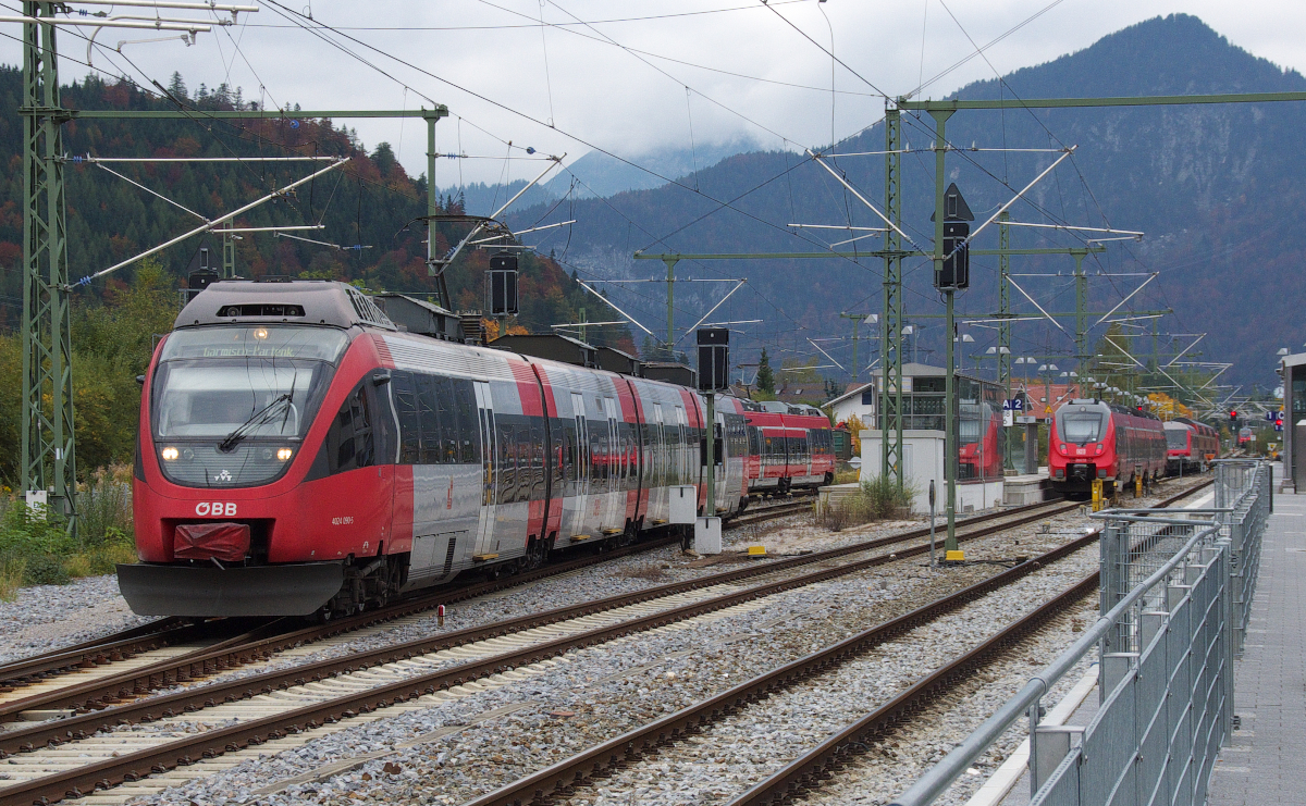 Die ganze Woche über war ein Werbetalent der ÖBB zwischen Innsbruck und Garmisch-Partenkirchen im Einsatz. Am Samstag den 10.10.2015 war leider wieder ein "normaler" Talent auf der Mittenwaldbahn unterwegs. ÖBB 4024 090-5 verlässt gerade den Bahnhof Mittenwald in Richtung Garmisch-Partenkirchen. Bahnstrecke 5504 München Hbf. - Mittenwald Grenze. Erhard Pitzius