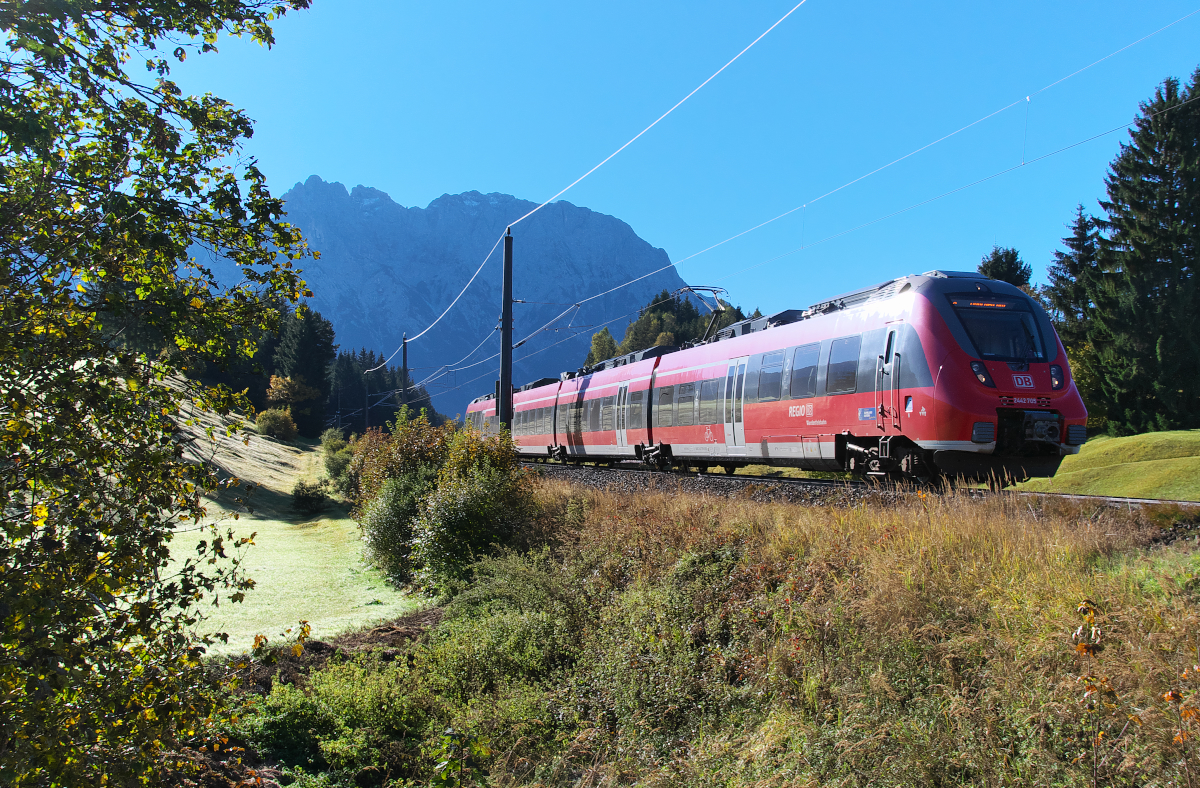 . Ferien in Mittenwald - Kaum angekommen im Landhaus Wackerl in der Nähe von Klais zog es die Bahnfotografen an die Strecke München Hbf - Mittenwald Grenze. Prompt fuhr der Hamster 442 732-0 (94 80 2442 732-0 D-DB) als RB Innsbruck Hbf - München Hbf bei Kaiserwetter die Schmalenseehöhe in Richtung Klais hinunter und konnte vor der Kulisse des Kawendels abgelichtet werden. Mittenwald am Quicken, 04.10.2015 (Hans) De Rond Hans und Jeanny