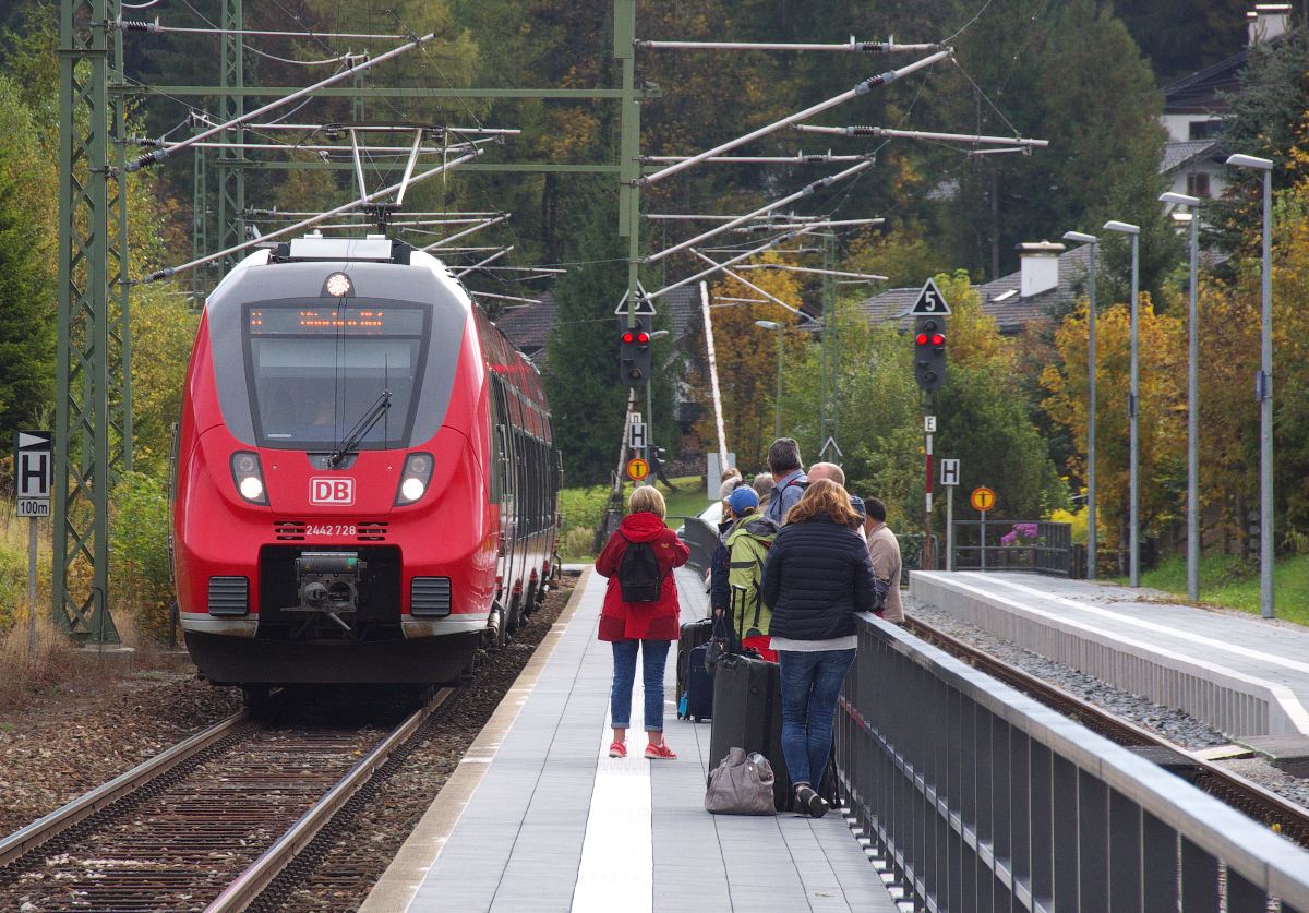 Während, Jeanny, Ivie und Hans in der "Masse" der Reisenden auf das Hamsterbäckchen warteten, hatte ich mich hundert Meter abgesetzt, um die Szene auf den Chip zu bannen. 2442 228 ist als RB nach München Hbf. unterwegs und fährt in den Bahnhof Klais ein, der für den G 7 Gipfel herausgeputzt wurde. Wir werden nur bis Murnau mitfahren, denn wir wollen zum Schloß Linderhof. In Murnau geht es weiter mit einem Minihamster bis Oberammergau und dann mit dem Bus (RVO) bis nach Linderhof. Bahnstrecke 5504 München Hbf. - Mittenwald Grenze am 09.10.2015 Erhard Pitzius