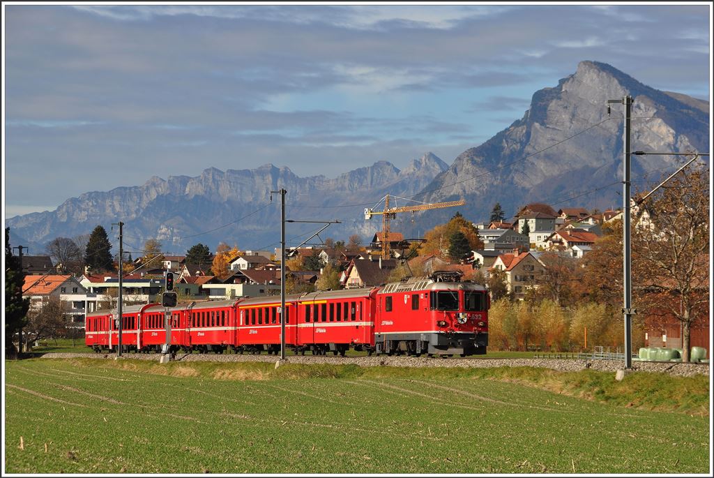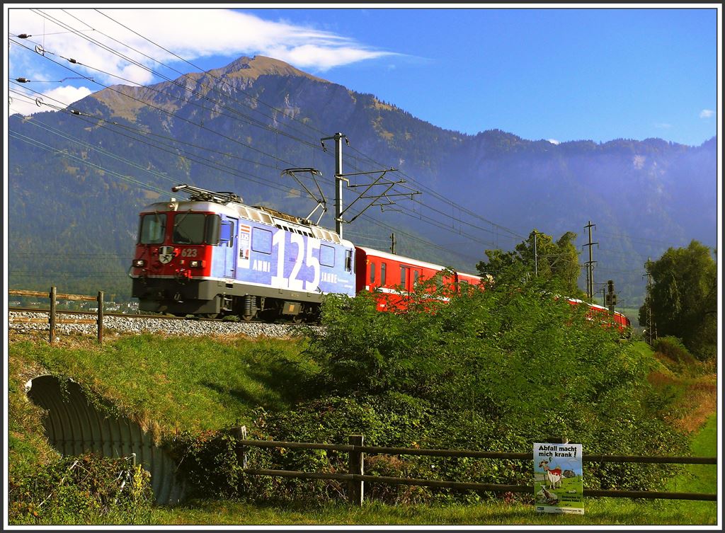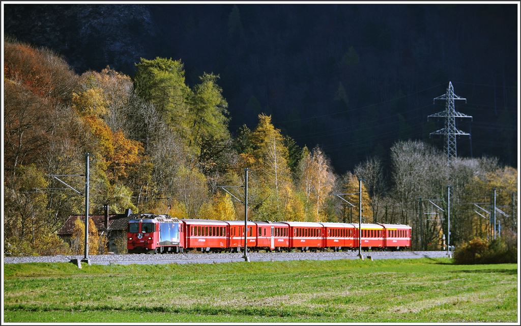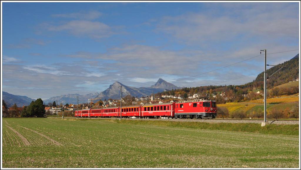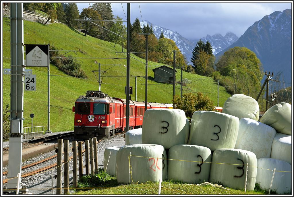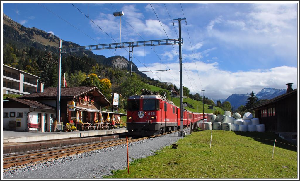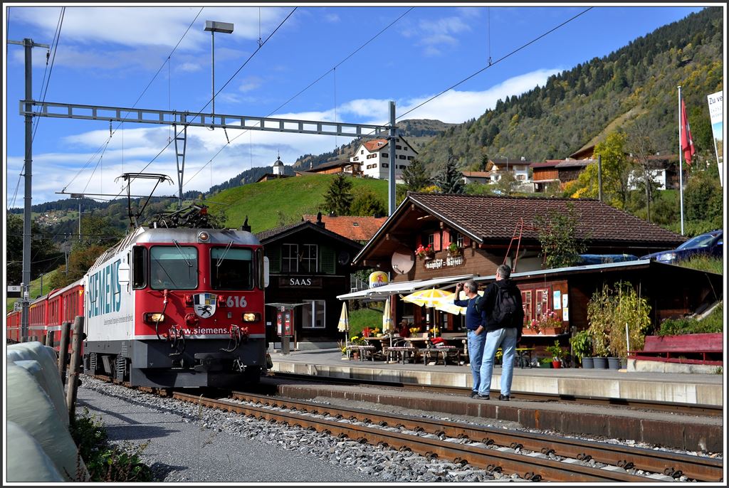 RE1240 mit Ge 4/4 II 628 "S-chanf" nach Disentis/Mustér legt vor dem kleinsten Bahnhofbuffet der Schweiz in Saas i/Prättigau einen kurzen Halt ein. (02.10.2015) Herbert Graf
