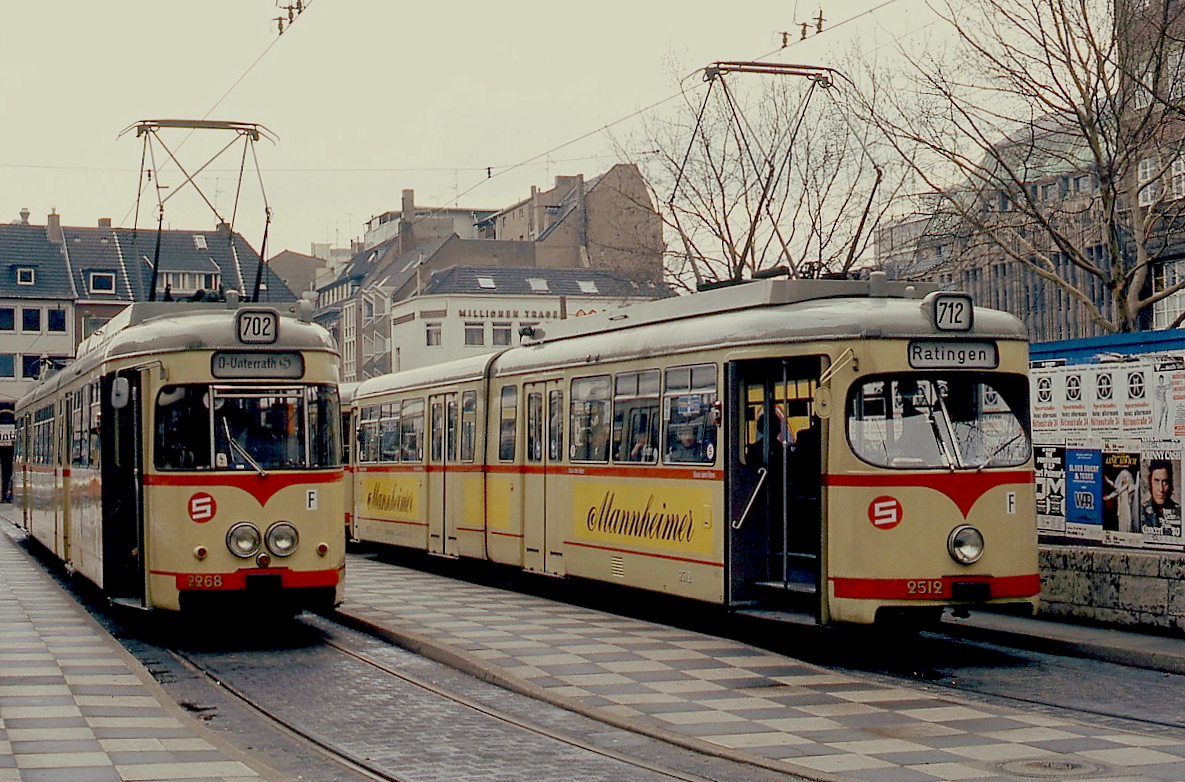 Anfang der 1980er Jahre stehen der GT6 2512 als Linie 712 nach Ratingen und der K66 2268 als Linie 702 nach Unterrath S an der Haltestelle Wilhelm-Marx-Haus. Zu diesem Zeitpunkt war das auf dem vorherigen Bild sichtbare Carschhaus bereits abgetragen, dadurch reichte der Blick hinüber zum Kaufhof an der Kö. Der K66 2268 gehörte zu einer Reihe von vier Zweirichtungsachtachsern, die ursprünglich für die Fernbahnlinie nach Krefeld beschafft worden waren und - nachdem sie dort die GT8S ersetzt hatten - im innerstädtischen Liniendienst eingesetzt wurden. Horst Lüdicke
