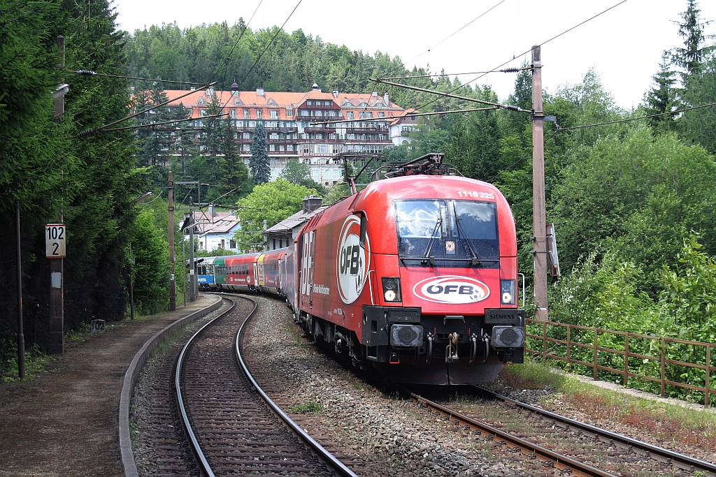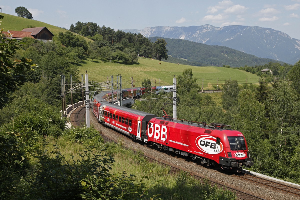 ÖBB 1116 225 mit den ÖFB Railjet auf ungewohnter Strecke, wegen der Sperre am Semmering wude im Umlauf 151 - 158 - 159 - 150 ein ÖBB RJ eingesetzt statt der herkömmlichen EC Garnitur in österreichischen Abschnitt zwischen Spielfeld - Mürzzuschlag!