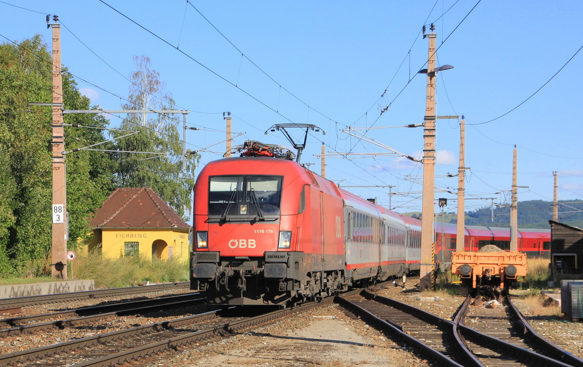 ÖBB 1116 225 "ÖFB " schiebt am 07.09.2015 den RJ 632 (Lienz- Villach Hbf.-Wien Hbf.) über die Brücke bei der ehemaligen Drauschleife in Wernberg. Bernhard Schindlauer