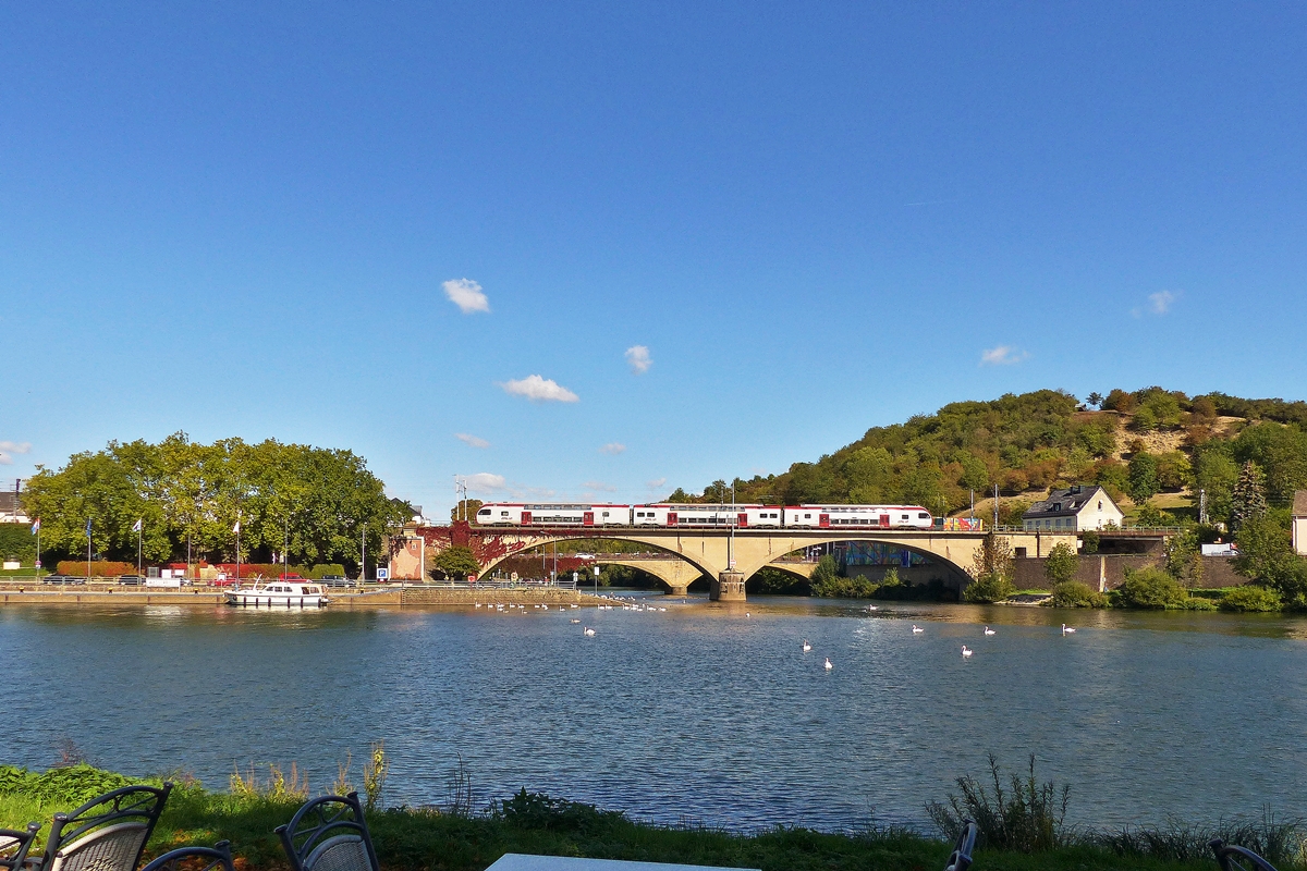 . Herbst an der Mosel - Auf unserer Lieblingsterrasse in Oberbillig kann man nicht nur hervorragend schlemmen, sondern man hat auch noch eine wunderbare Aussicht auf die Sauerbrücke in Wasserbillig und auf die dort verkehrenden Züge. Ein unerkannt gebliebener CFL KISS rollt abgebügelt über die Grenzbrücke zwischen Luxemburg und Deutschland, er ist als RE 5110 Trier Hbf - Luxembourg unterwegs und wird in Kürze den Bahnhof von Wasserbillig erreichen. 27.09.2015 (Jeanny) De Rond Hans und Jeanny