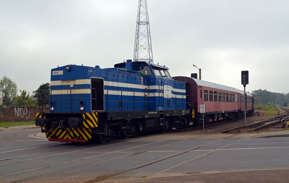 201 004 des Magdeburger Hafens bespannte am 12.09.15 den ersten Sonderzug des Tages. Anlässlich des Familientages wurden mehrere Sonderzüge zwischen dem Magdeburger Hafen und dem Enercon-Standort in Rothensee gefahren. Hier steht der Zug bei Enercon für die Rückfahrt bereit. Martin Schneider