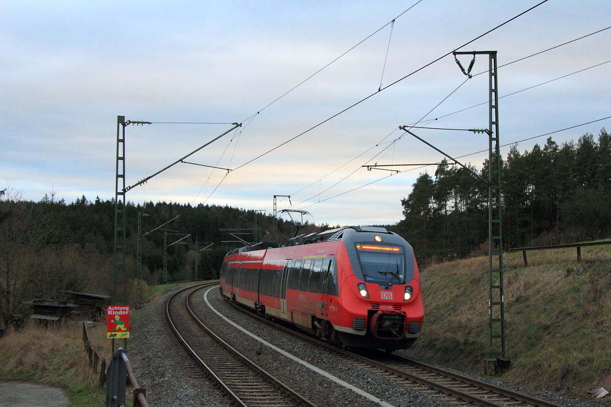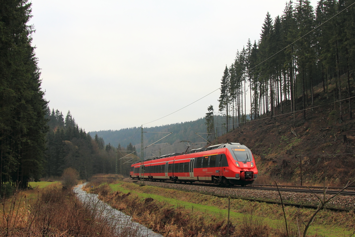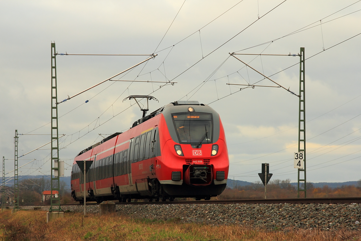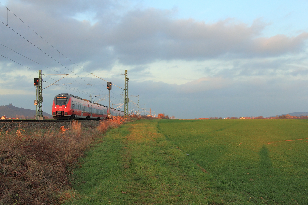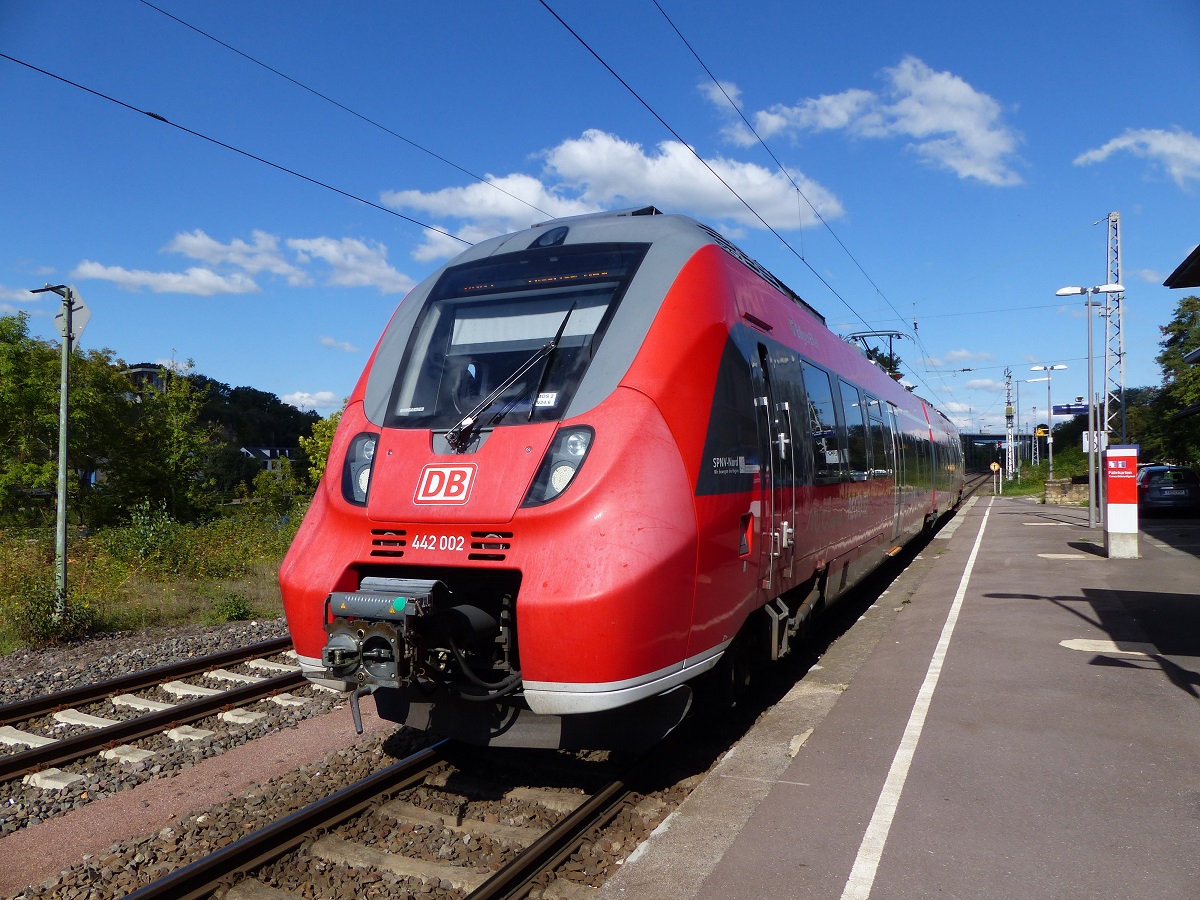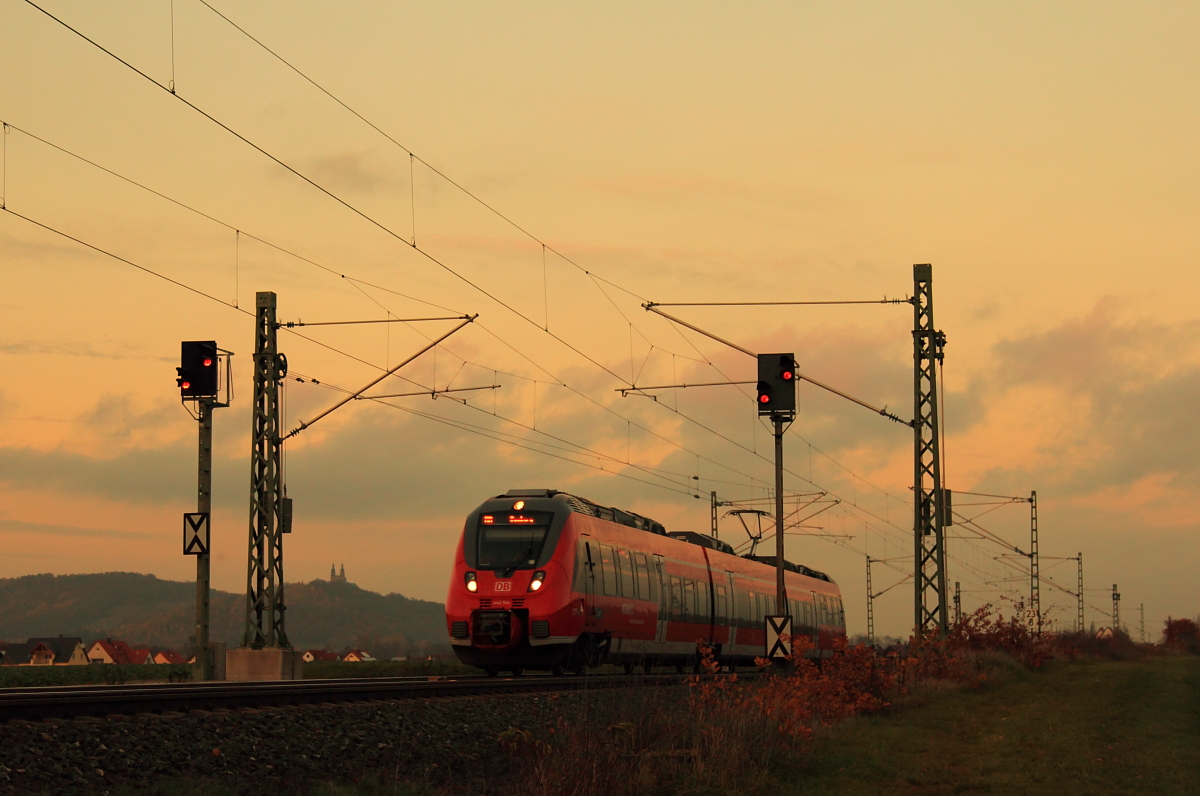 Der silberne S-Bahn Mitteldeutschland Hamster 1442 213 am Bahnsteig als S4 nach Geithain in Leipzig Thekla wartet, wird er von seinem roten Bruder 442 711 überholt. Aufgenommen am 03.10.2015. Jens Baumhauer