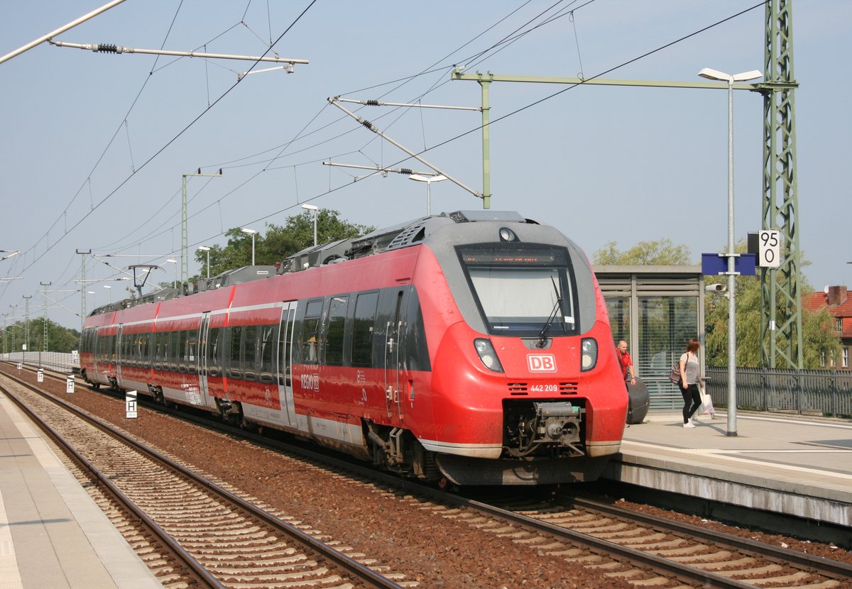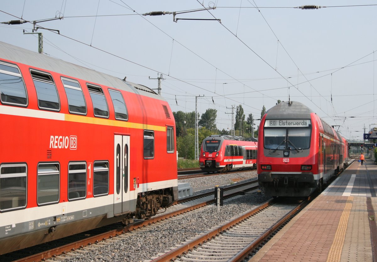 Hochbetrieb in Elsterwerda am 12.08.2015 (v.l.n.r.): Steuerwagen des RE 18312 (Elsterwerda–Stralsund Hbf), 442 151 als RB 28961 (Elsterwerda-Biehla–Dresden Hbf), Steuerwagen der RB 17163 (Elsterwerda–Mittweida) Gustav Richard