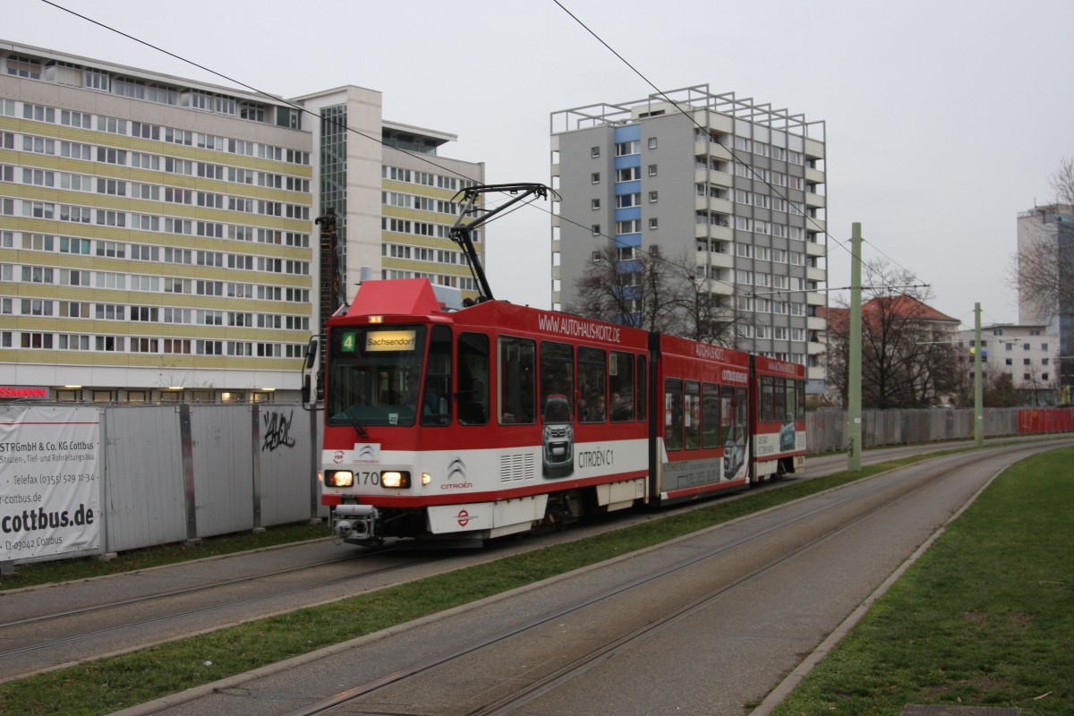 Tatra Tram Wagen 170 am 10.12.2015 auf der Linie 4 im Stadtgebiet Cottbus.