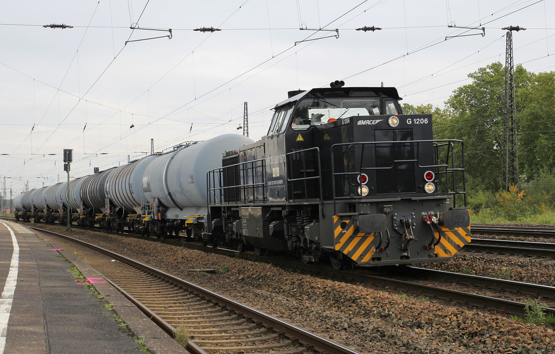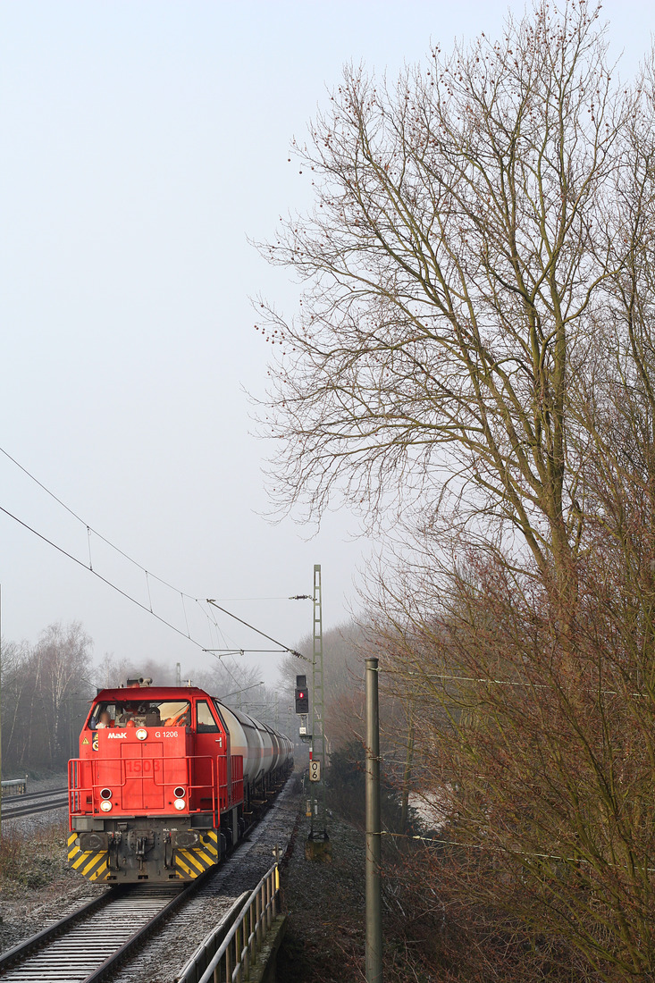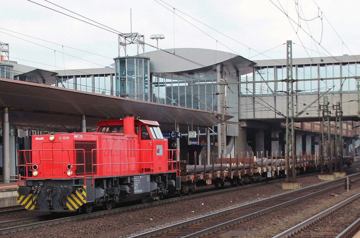 Als ich heute den Bahnhof Kassel-Wilhelmshöhe betrat,stand dieser kurze Güterzug mit der MAK G1206 (HLB) noch leer auf dem Bahnsteig 4, fuhr dann langsam raus...knapp eine Stunde später kam er beladen in Gegenrichtung zurück (8.4.2015). Andreas Niedermeyer