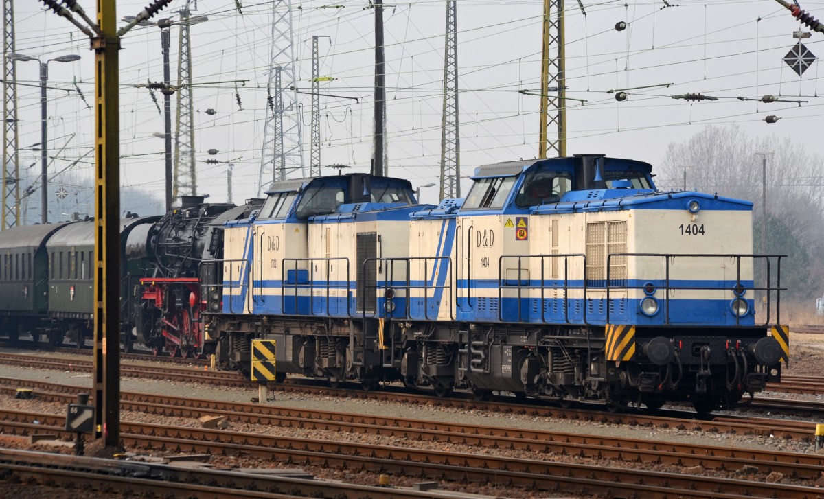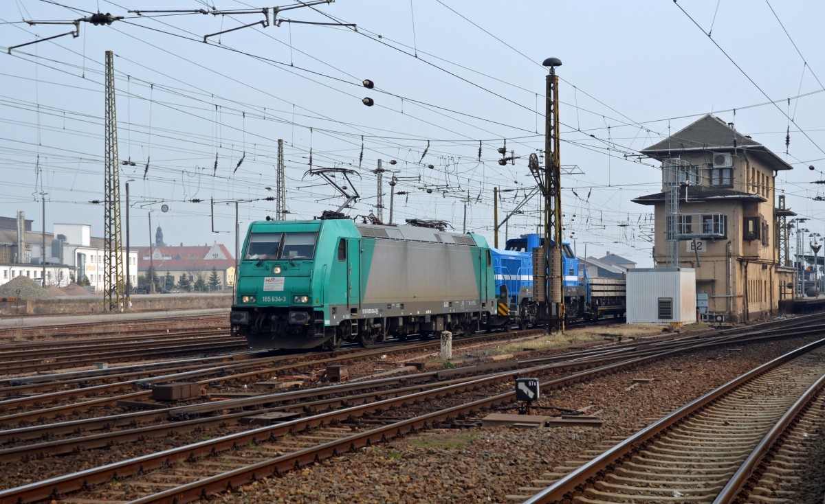 185 634 zog am 21.03.15 neben ihren Schwellenganzzug noch 120 001 durch Riesa Richtung Leipzig. Die Diesellok vom Typ Vossloh G 12 ist für Spitzke im Einsatz. Martin Schneider