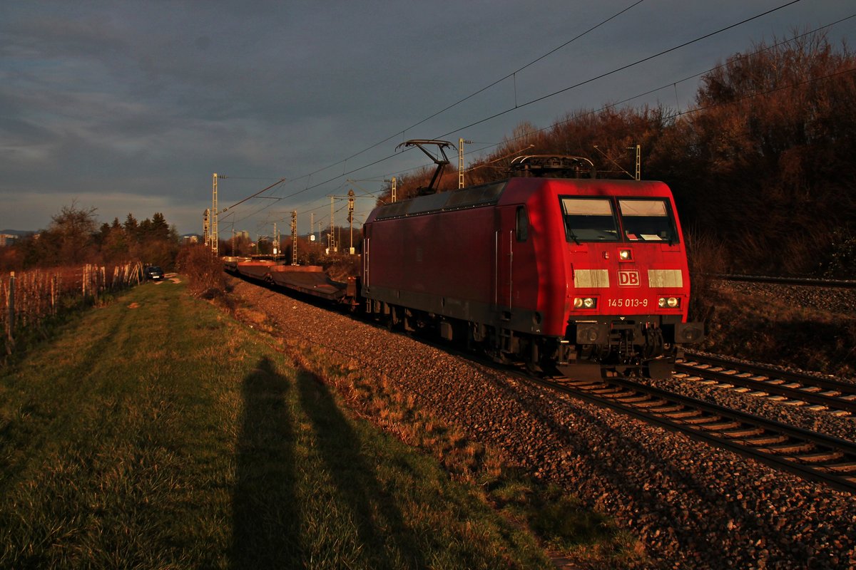 Am 22.12.2015 fuhr 145 013-9 mit einem leeren Fiatzug (Lahr (Schwarzw.) - Alessandira) nach mehrere Überholungen beim Abzweig Leutersberg in Richtung Basel, um an der Schweizer Grenze den Zug an Schweizer Maschinen abzugeben. Tobias Schmidt