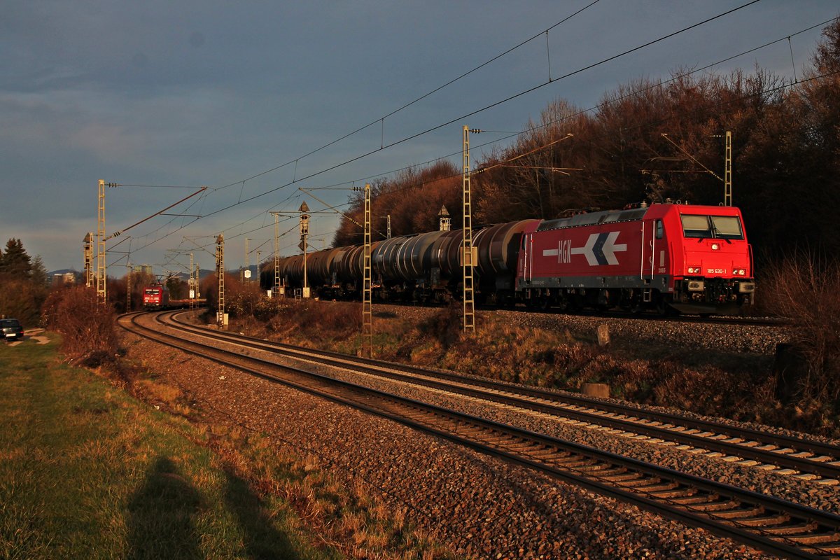 Aus Richtung Freiburg Hauptbahnhof fuhr am 22.12.2015 die Alpha Trains/RheinCargo 2065 (185 630-1) "HGK" mit einem Kesselzug beim Abzweig Leutersberg in Richtung Schweizer Grenze. Tobias Schmidt