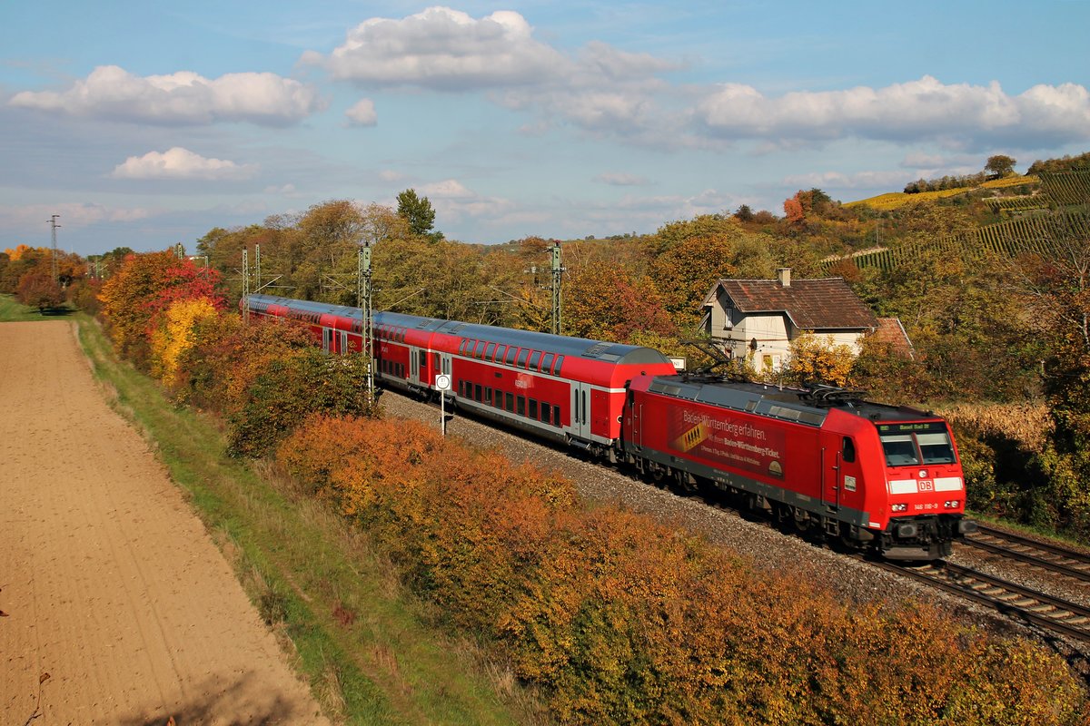 Nachschuss auf die Freiburger 146 114-4 "Baden Württemberg erfahren/Landkreis Emmendingen", als sie am 25.10.2015 ihren RE (Basel Bad Bf - Offenburg) in den Bahnhof von Müllheim (Baden) sachob. Tobias Schmidt
