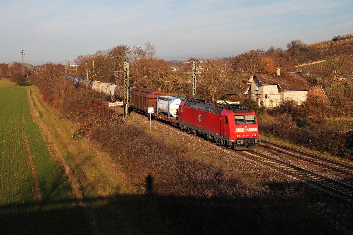 Mit einem gemnischten Güterzug (Mannheim Rbf - Chiasso) fuhr am 05.12.2015 die 185 136-9 südlich von Müllheim (baden) in Richtung Schweizer Grenze. Tobias Schmidt