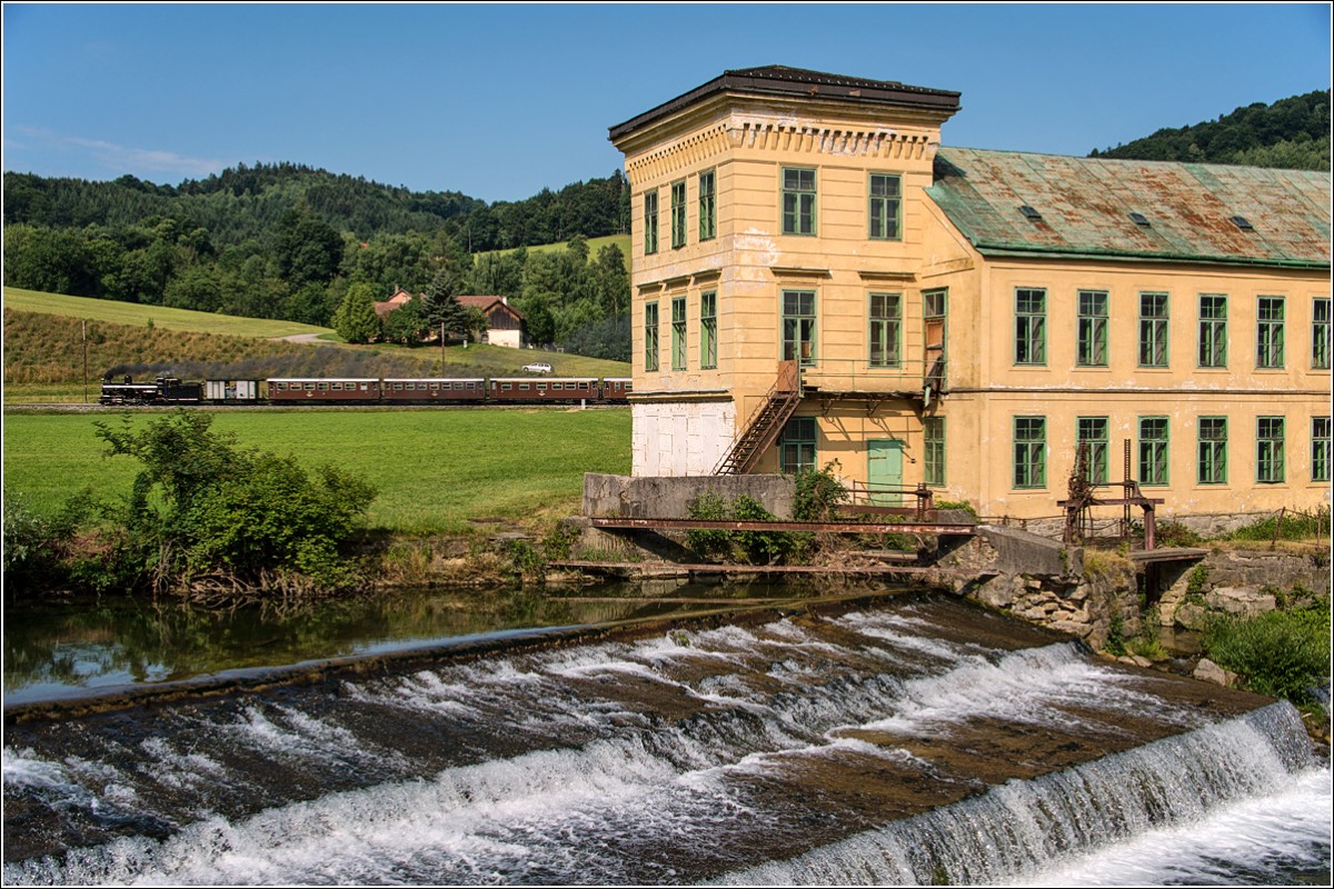 Bei Mainburg befindet sich diese alte Mühle mit Wehranlage. Mh6 mit dem monatlichen Dampfzug auf dem Weg nach Mariazell, 12.7.2015.