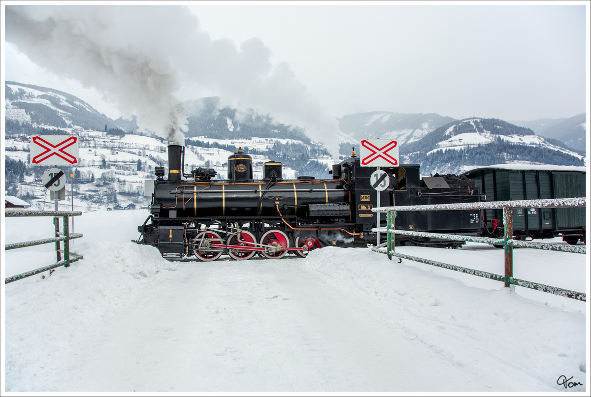 Mh.3 der Pinzgauer Lokalbahn mit dem Fotozug Sdz 900 von Zell am See nach Krimml am 1.2.2015 kurz vor Niedernsill aufgenommen.