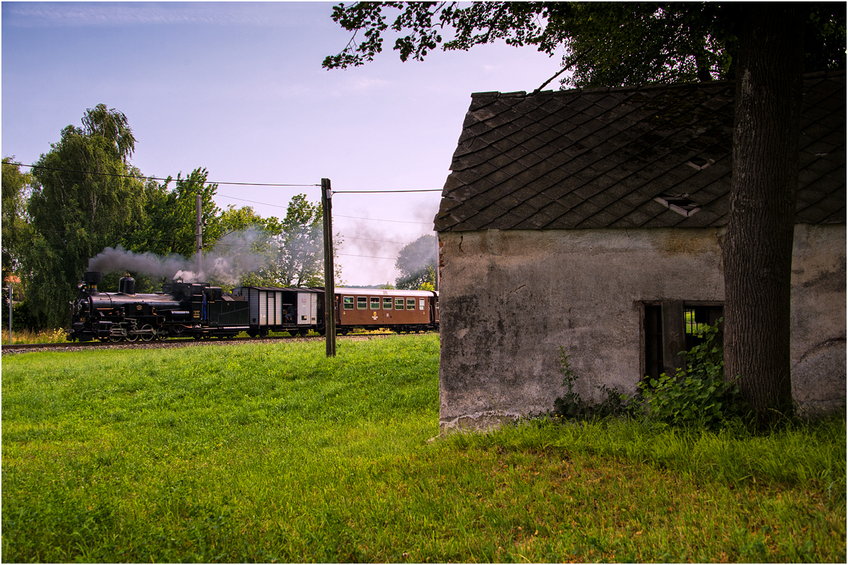 Zum Abschluss noch ein Motivklassiker der Mariazellerbahn, das Andreaskircherl zw. Steinschal-Tradigist und Kirchberg/Pielach. Mh.6 mit Dampfzug von Mariazell nach St.Pölten, 12.7.2015