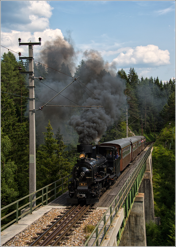 Jeden 1. Sonntag zw. Mai und Oktober fährt die Mh6 einen Zug nach Mariazell. Am 12.7.2015 war es wieder so weit, als der Zug an meinem Standpunkt in Nadelbach an mir vorbeirollte. Leider war auch wieder die  Fotowolke  vom Dienst mit von der Partie.