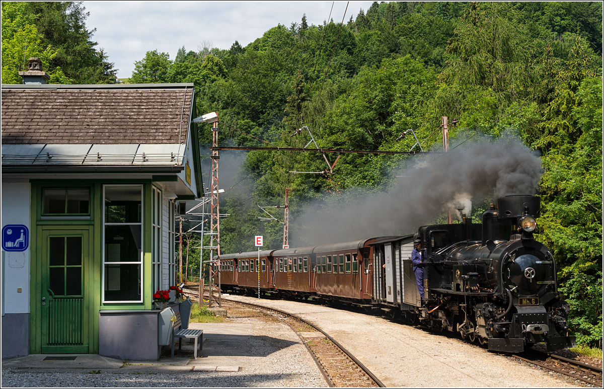 Mh6 mit dem Dampfzug nach Mariazell bei der Durchfahrt durch Puchenstuben, 12.7.2015