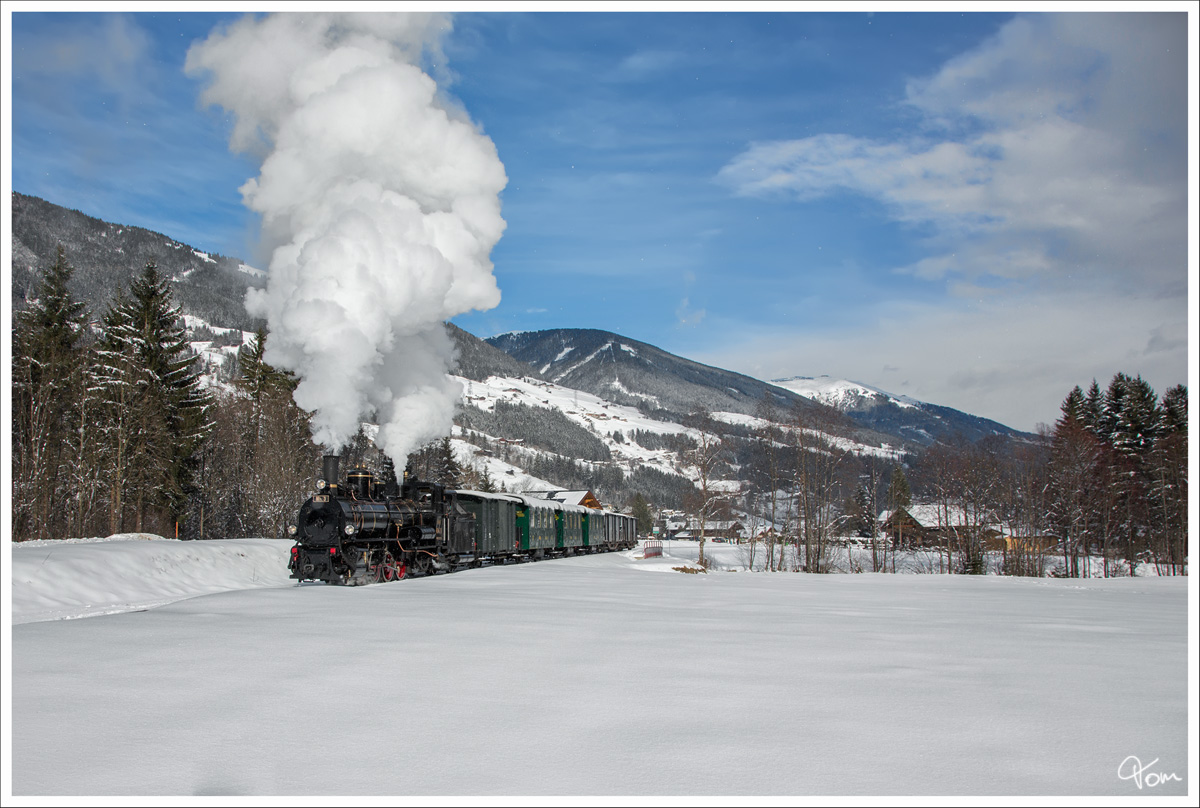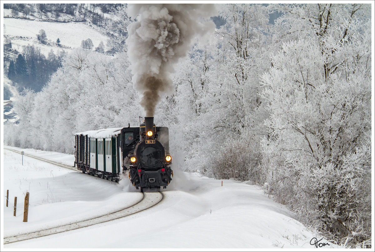 Mh.3 der Pinzgauer Lokalbahn mit dem Fotozug Sdz 900 von Zell am See nach Krimml am 1.2.2015 nächst Fürth aufgenommen.