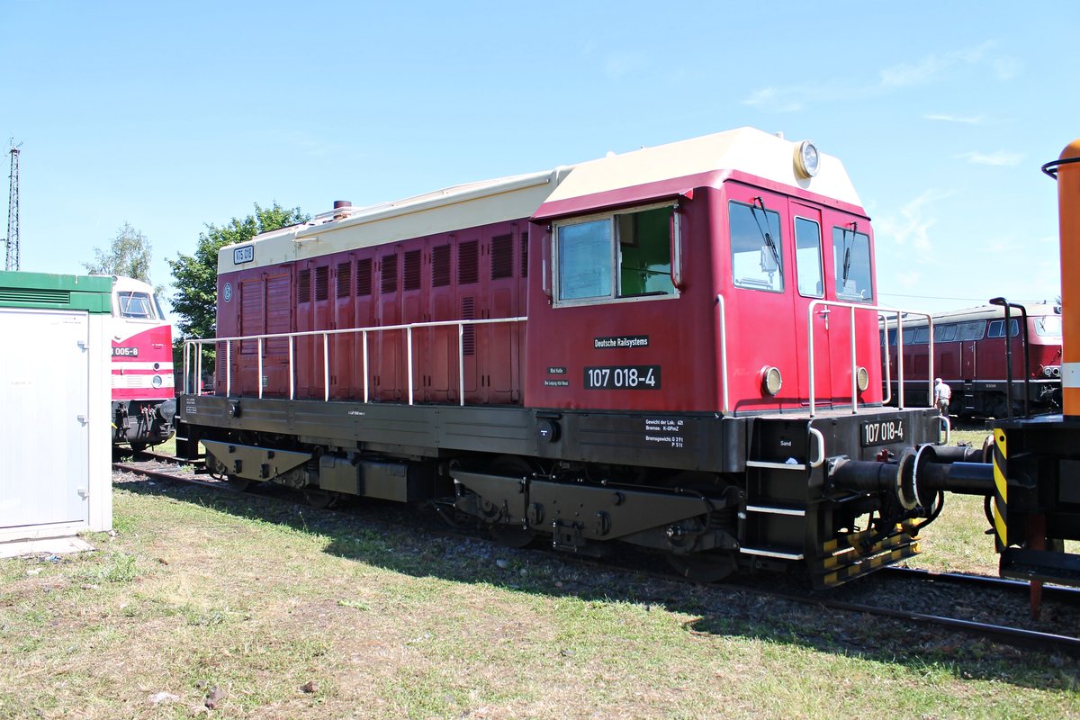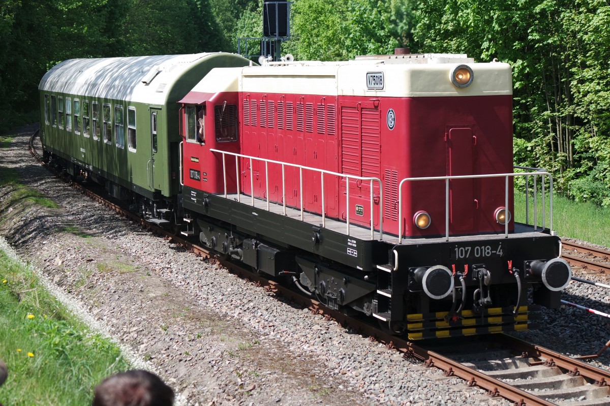 Vom 14.05.-17.05.2015 fanden im Eisenbahnmuseum Schwarzenberg die 23. Eisenbahntage statt.Zur Lokparade am 17.05.2015 zog Railsystem 107 018 einen DR Reisezugwagen an den Zuschauern vorbei. Steffen Eule