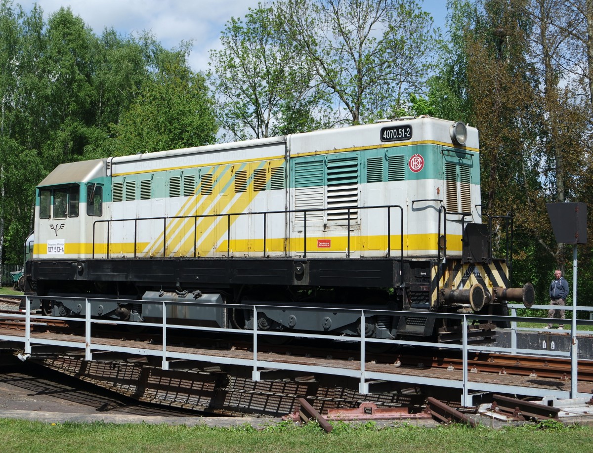 Vom 14.05.-17.05.2015 fanden im Eisenbahnmuseum Schwarzenberg die 23. Eisenbahntage statt. Hier präsentiert sich Railsystem 107 513 auf der Drehscheibe.Aufgenommen am 17.05.2015. Steffen Eule