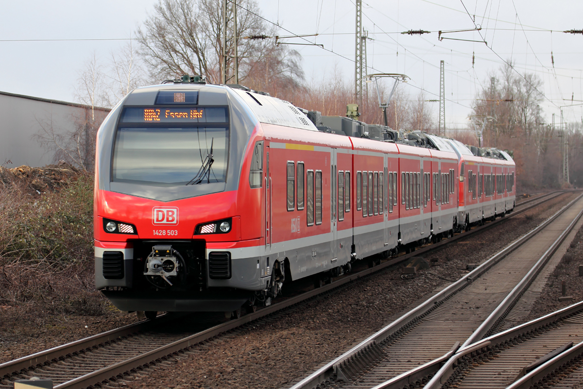 Der Planeinsatz der neuen FLIRT-Vierteiler bei DB Regio hat begonnen: 1428 009 und 007 als RB 42 (Haard-Bahn Münster - Essen) im Vorfeld des Hbf Wanne-Eickel (26.2.15). Hermann-Josef Weirich