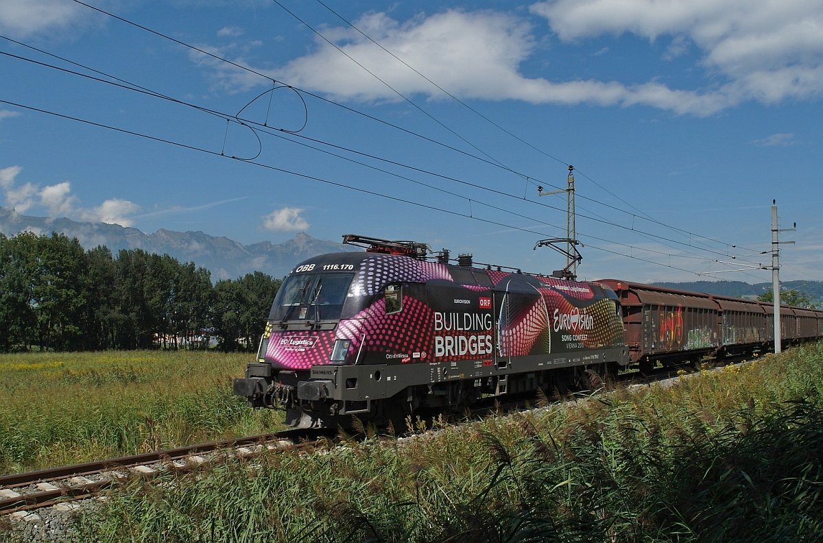 Vom österreichischen Feldkirch ins schweizerische Buchs verläuft der längste Streckenabschnitt der Vorarlbergbahn durch das Fürstentum Lichtenstein. Kurz vor dem Zielbahnhof Buchs (SG) zieht 1116 170 einen Schiebewandwagenganzzug das Rheintal hinunter. Mit den Bergen des Alpsteins im Hintergrund wurde am 24.08.2015 bei Nendeln (FL) auf den Auslöser gedrückt. Jürgen Vos