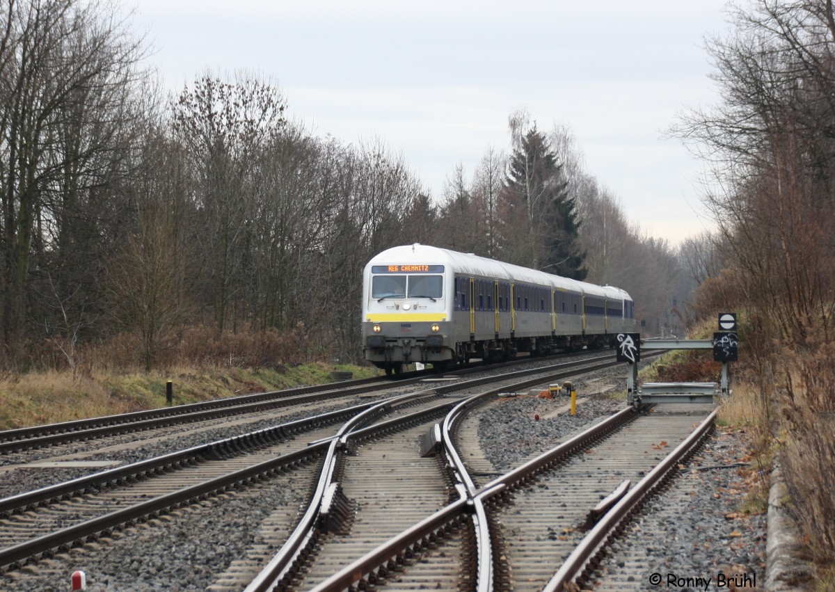 Seit dem Fahrplanwechsel am 13. Dezember 2015 kommen zwischen Chemnitz und Leipzig wieder lokbespannte Züge zum Einsatz. Eingesetzt werden die ehemaligen Nordlichter der NOB nun von der MRB. Am 16.12.15 wartet DE2000-02 noch im Lack des Vorbesitzers auf die Ausfahrt nach Chemnitz im Leipziger Hbf. Martin Schneider