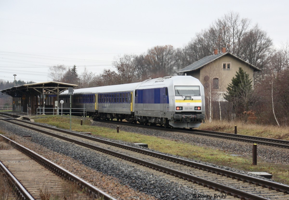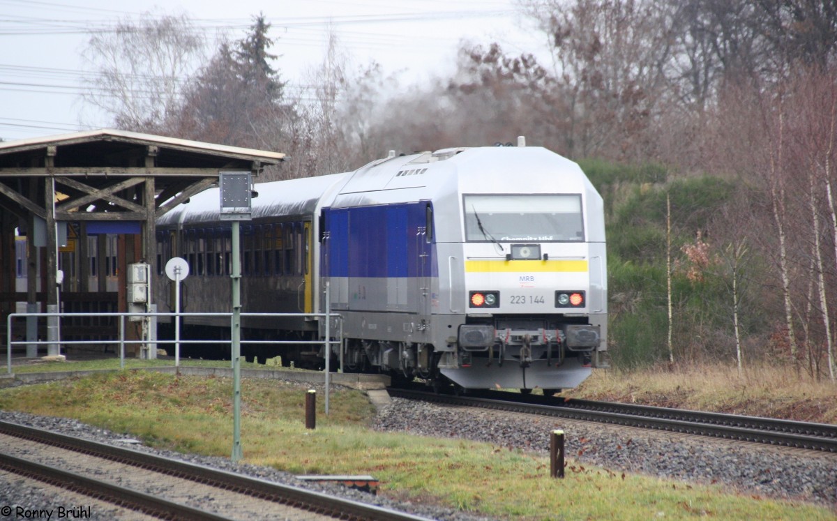 Am 1. Tag des Fahrplanwechsels zwischen Chemnitz und Leipzig am 14.12.2015 eine MRB Zugganitur mit 223 144 bei der Einfahrt im oberen Bahnhof Wittgensdorf.