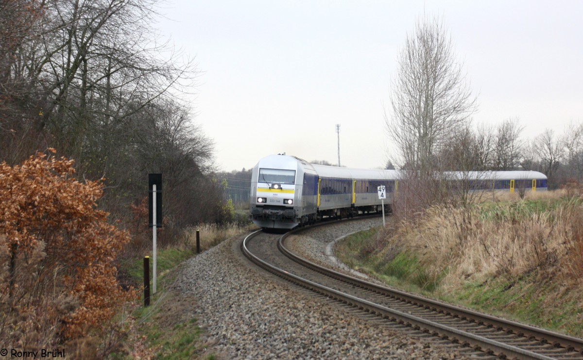 Am 1. Tag nach dem Fahrplanwechsel, ist MRB 223 144 von Burgstädt nach Wittgensdorf bei Herrenhaide unterwegs und legt sich rasant in die Kurve. 14.12.2015 Ronny Brühl