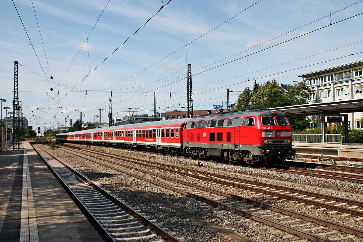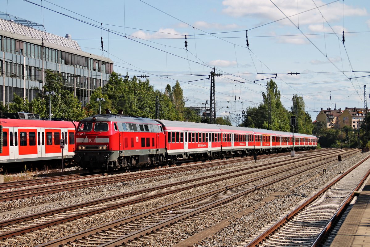 Durchfahrt am 25.08.2015 von der Mühldorfer 218 423-2 mit ihrer 7-Wagen RB (München Hbf - Mühldorf) in München Heimeranplatz gen Ostbahnhof. Tobias Schmidt