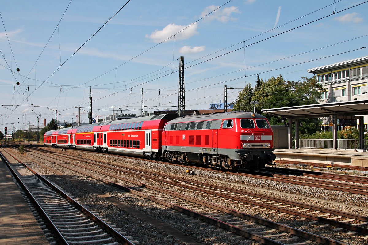 Mit ihrem RE (München Hbf - Mühldorf) fuhr am 25.08.2015 die glänzende Mühldorfer 218 421-6 durch München Heimeranplatz gen Ostbahnhof. Tobias Schmidt