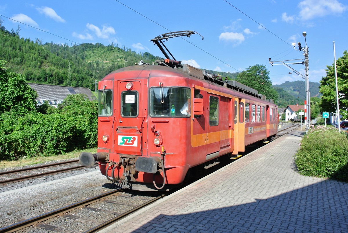 Aufgrund der Kollision zweier Stadler Züge dieses Jahr verkehrt der ehem. SZU Triebwagen Mo-Fr wieder planmässig als Regio zwischen Peggau und Übelbach. Im Bild ist der ET 15 (STLB 94 81 4481 015-7, ex BDe 4/4 593 bzw. BDe 4/4 93) beim Endbahnhof Peggau. Der alte Triebwagen darf nur Zwischen Übelbach und Peggau verkehren, deshalb verkehrt der letzte noch fahrbare Stadler GTW auf den direkten Zügen Übelbach-Graz, 10.07.2015. Simon Bütikofer