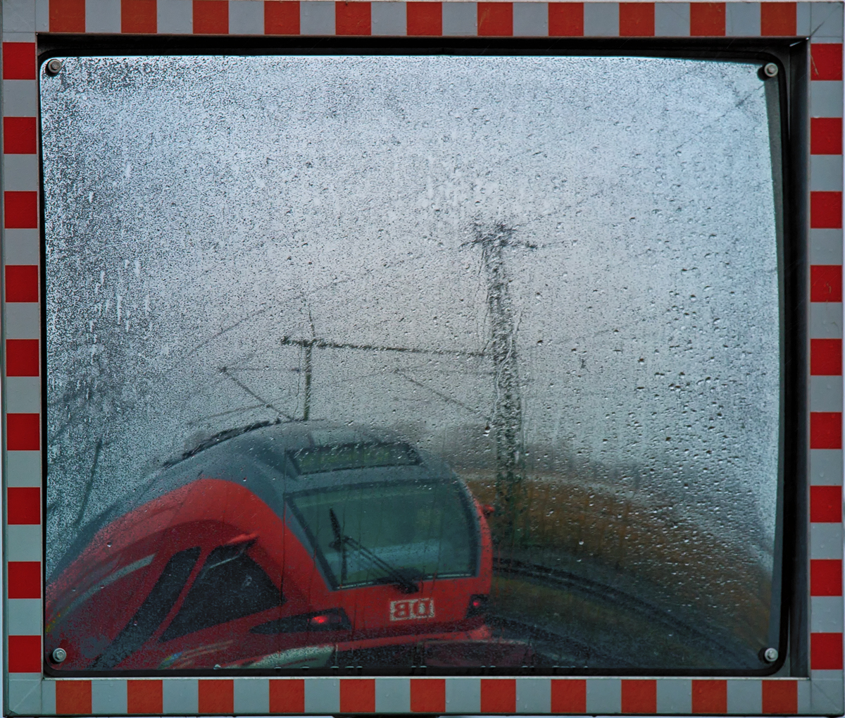 Auch mit über dem Kopf gehaltener Kamera war der DB Regio Flirt in Lietzow auf Rügen nicht komplett in den Spiegel zu bekommen. - 01.02.2016 Gerd Wiese