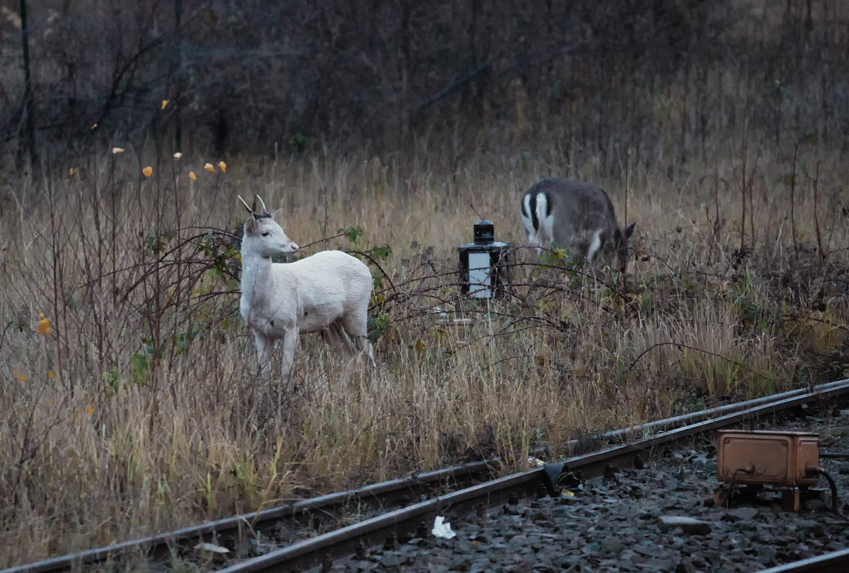 Am Morgen des 8. Dezember 2016 war der Takt der S-Bahn durcheinander geraten. An dieser Stelle harrte ich dann in unbequemer Position mit Vorfokusierung auf die Zweige im Vordergrund auf die Bahn, die dann irgendwann unangekündigt von links hinter den Sträuchern hervorkommen sollte. Irgendwann wurde mir dass dann zu anstrengend und außerdem hatte ich mit der S-Bahn von der anderen Seite ein anderes Motiv vor, und so blieb nur diese Probeaufnahme ohne Zug.