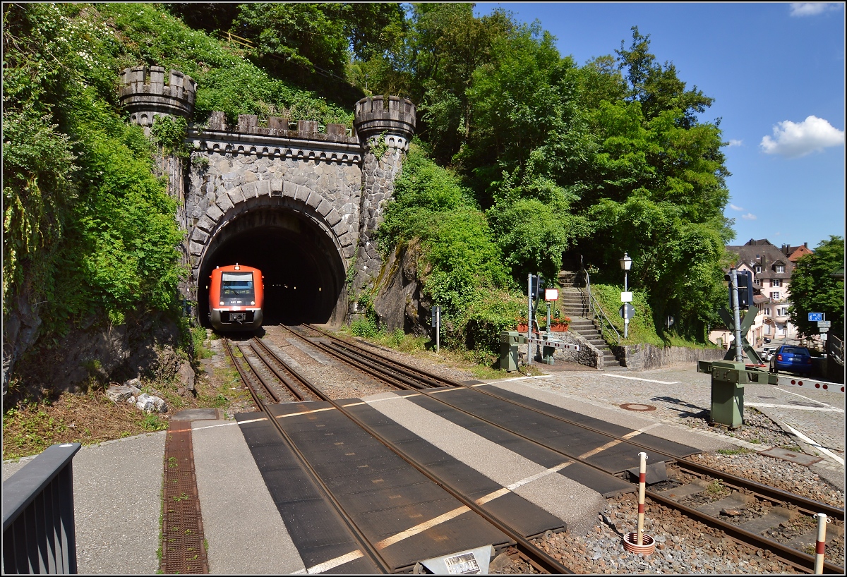 Massives Tunnelportal in Laufenburg. Bei diesem repräsentativen Bau wirkt selbst ein ausgewachsener Blauwal im roten DB-Kleid winzig. 641 002 bei der Einfahrt in den Bahnhof Laufenburg, Juni 2016.
