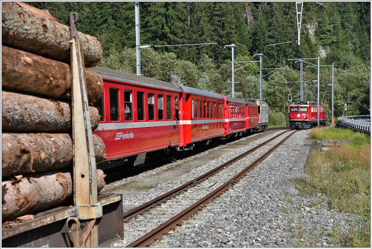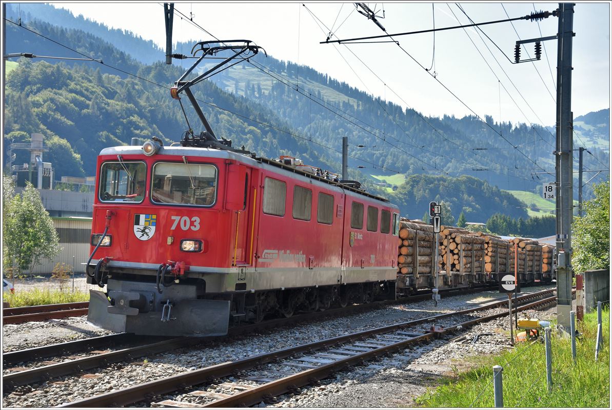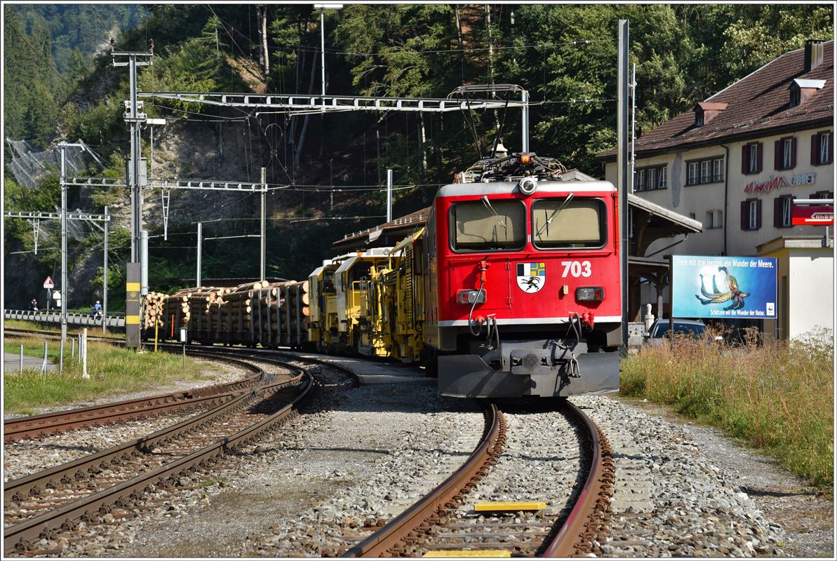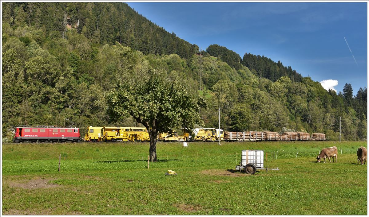 Ge 6/6 II 703 ist beschäftigt mit der Abfuhr von Stammholz ab Furna und der Gleibaumaschine Palas B40UM-1 ab Fideris. Die Zugszusammenstellung in Fideris zieht sich wegen der ständig verkehrenden RE etwas in die Länge, gibt mir als Velofahrer aber genügend Zeit das Ganze festzuhalten. (02.09.2016) Herbert Graf