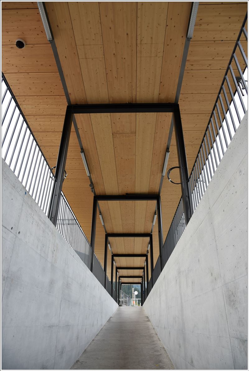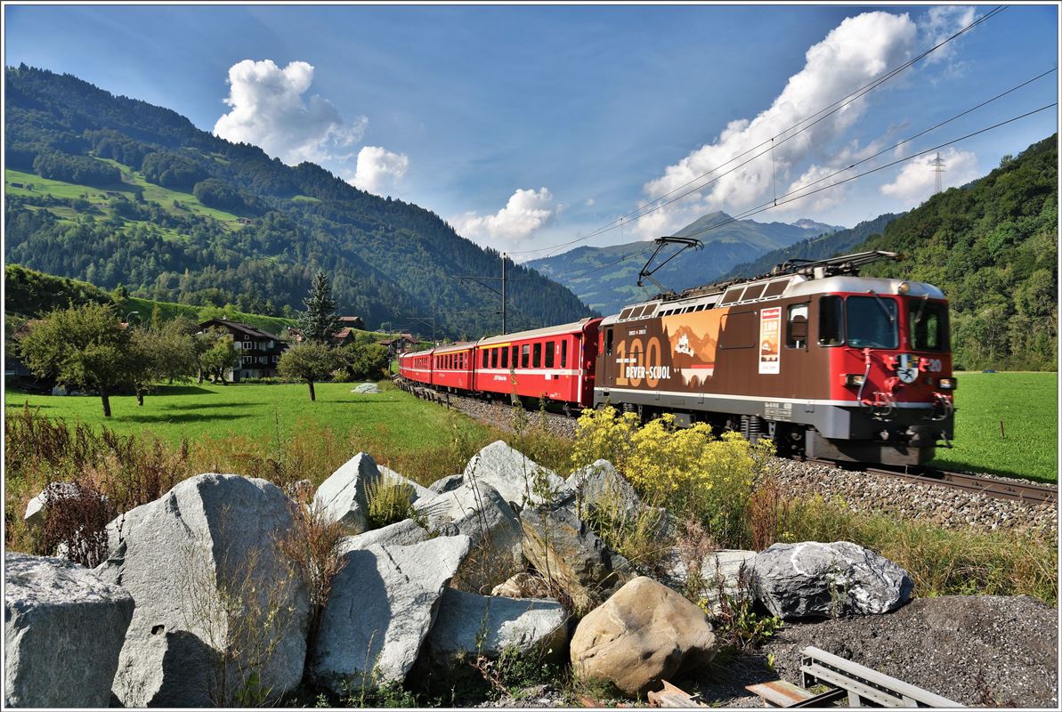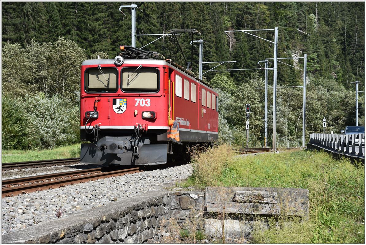 Ge 6/6 II 703 ist beschäftigt mit der Abfuhr von Stammholz ab Furna und der Gleibaumaschine Palas B40UM-1 ab Fideris. Die Zugszusammenstellung in Fideris zieht sich wegen der ständig verkehrenden RE etwas in die Länge, gibt mir als Velofahrer aber genügend Zeit das Ganze festzuhalten. (02.09.2016) Herbert Graf