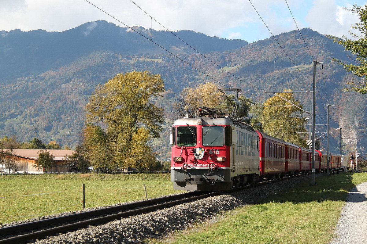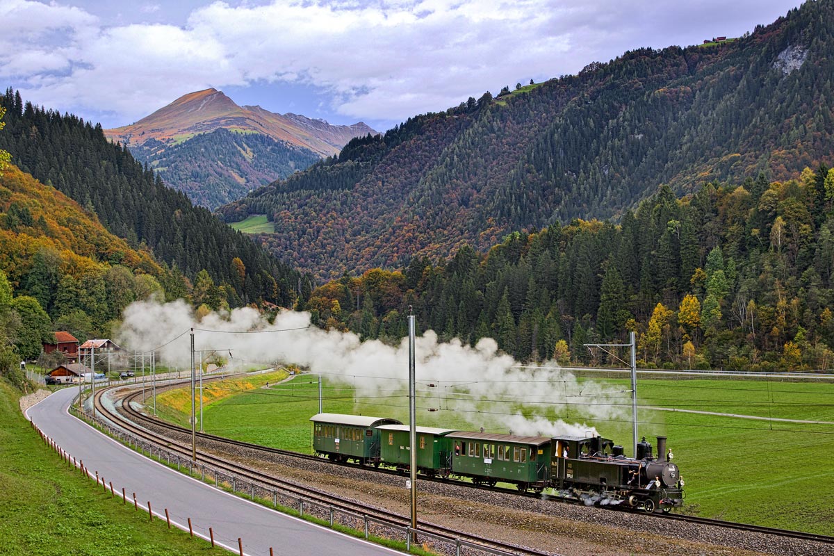 Am 14.10.2016 dampfz die Rhb Schmalspurdampflokomotive Ge 3/4 11 "Heidi" mit einem Sonderzug zum Auftakt des Bahnoldtimerwochenendes im Engadin von Landquart nach Samedan in Jenaz vorüber. Matti Morelli
